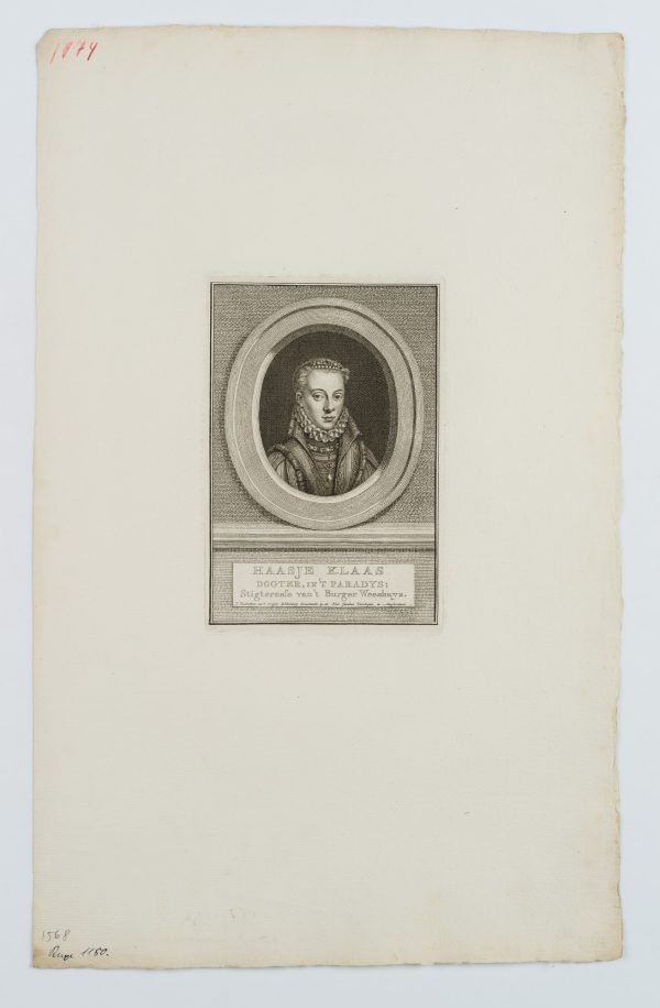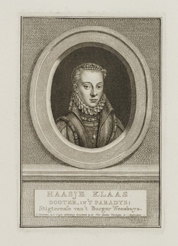 - Bezeichnung: Unterhalb des Ovals auf dem Schild mit dem Namen der Dargestellten und deren Lebensdaten auf niederländisch beschriftet: “Haasje Klaas | Dogter, int Paradys; Stigteresje van’t Burger Weeshuys.”, darunter signiert.