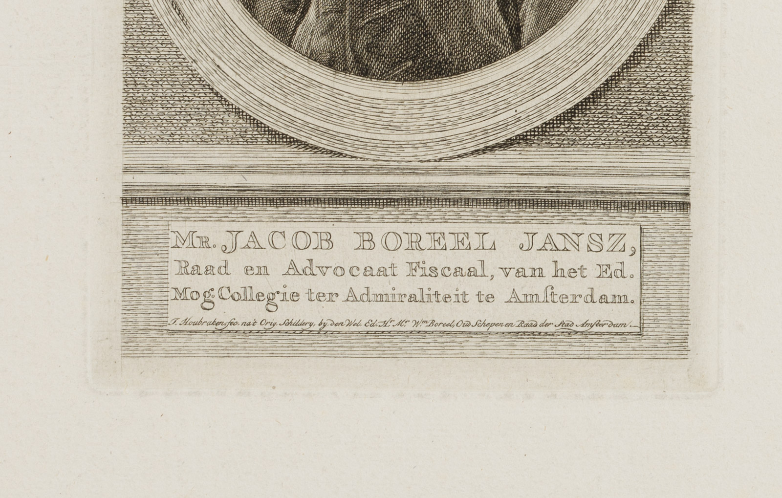 • Bezeichnung: Unterhalb des Ovals auf dem Schild mit dem Namen des Dargestellten auf niederländisch beschriftet: “Mr. Jacob Boreel Jansz, Raad en Advocaat Fiscaal, van het Ed. Mog. Collegie ter Admiraliteit te Amsterdam”, darunter signiert.