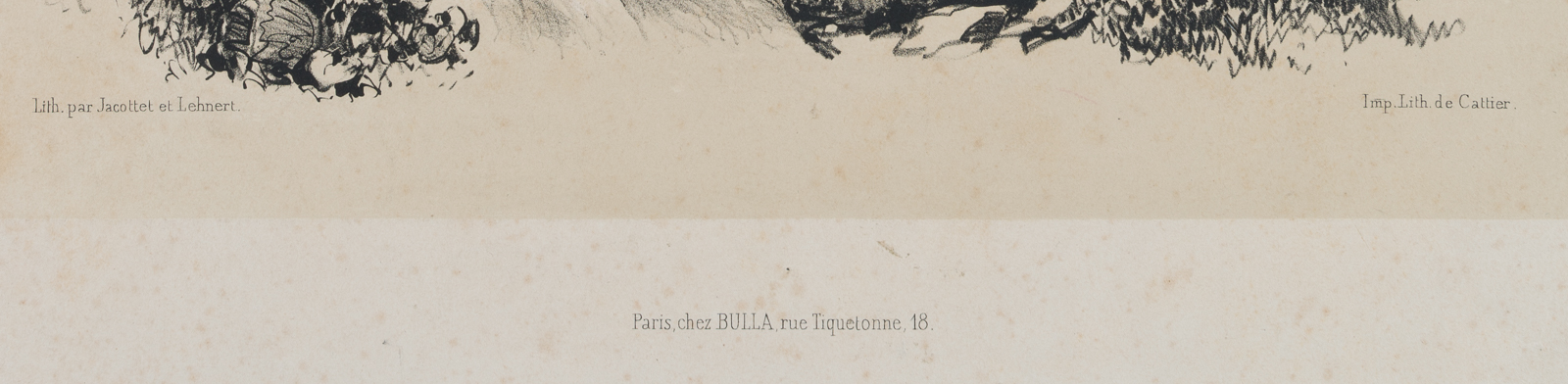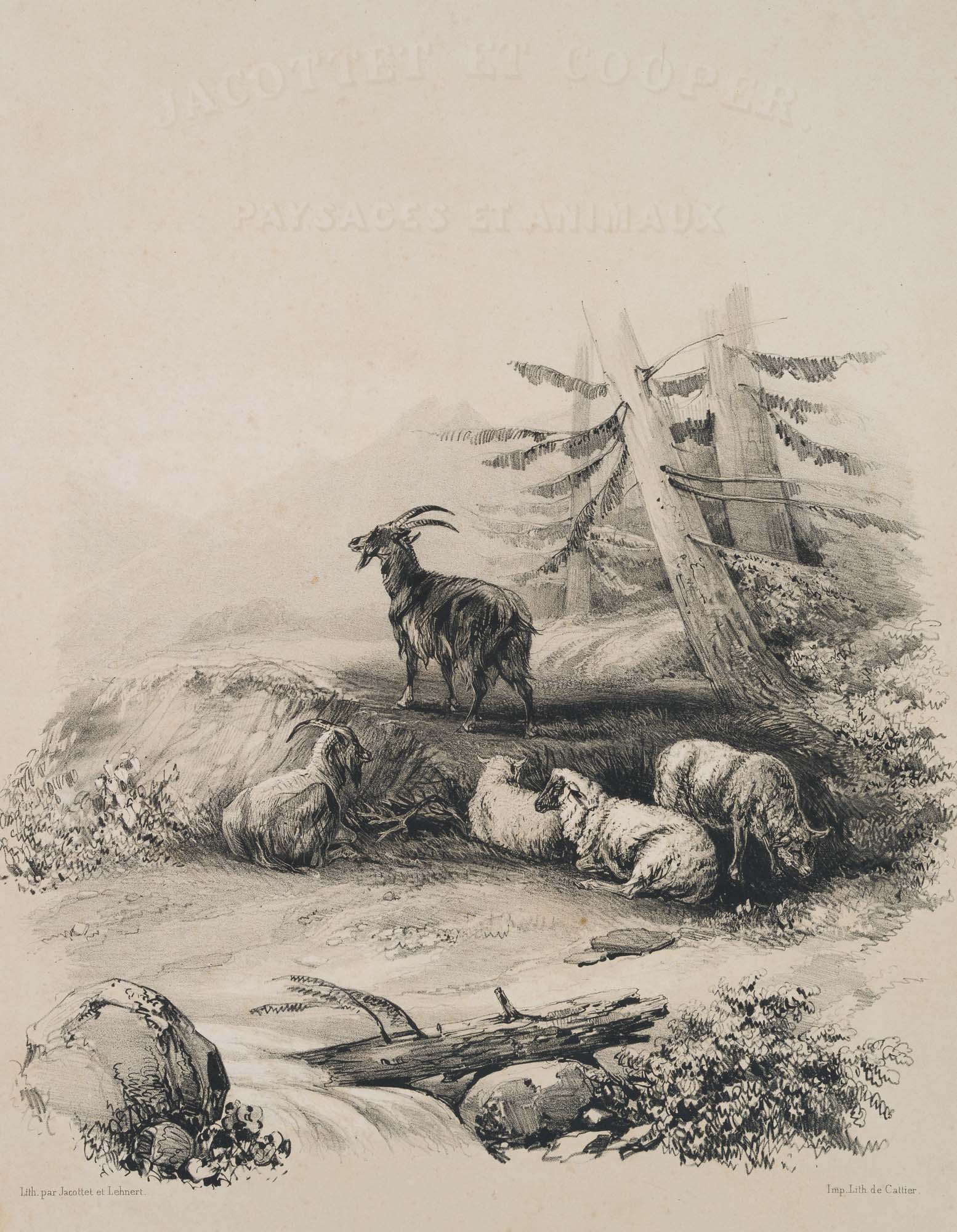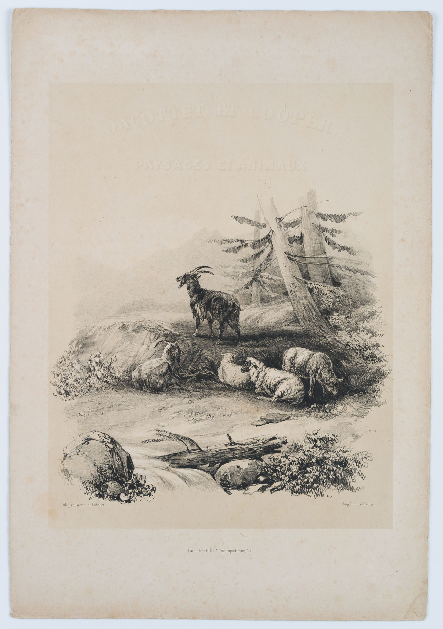• Inscription: Titled “Jacottet et Cooper. Paysages et animaux”. Signed at the bottom of the image “Lith. par Jacottet et Lehnert. / Imp. Lith. de Cattier”. Inscribed at the bottom centre “Paris chez BULLA rue Tiquetonne”.