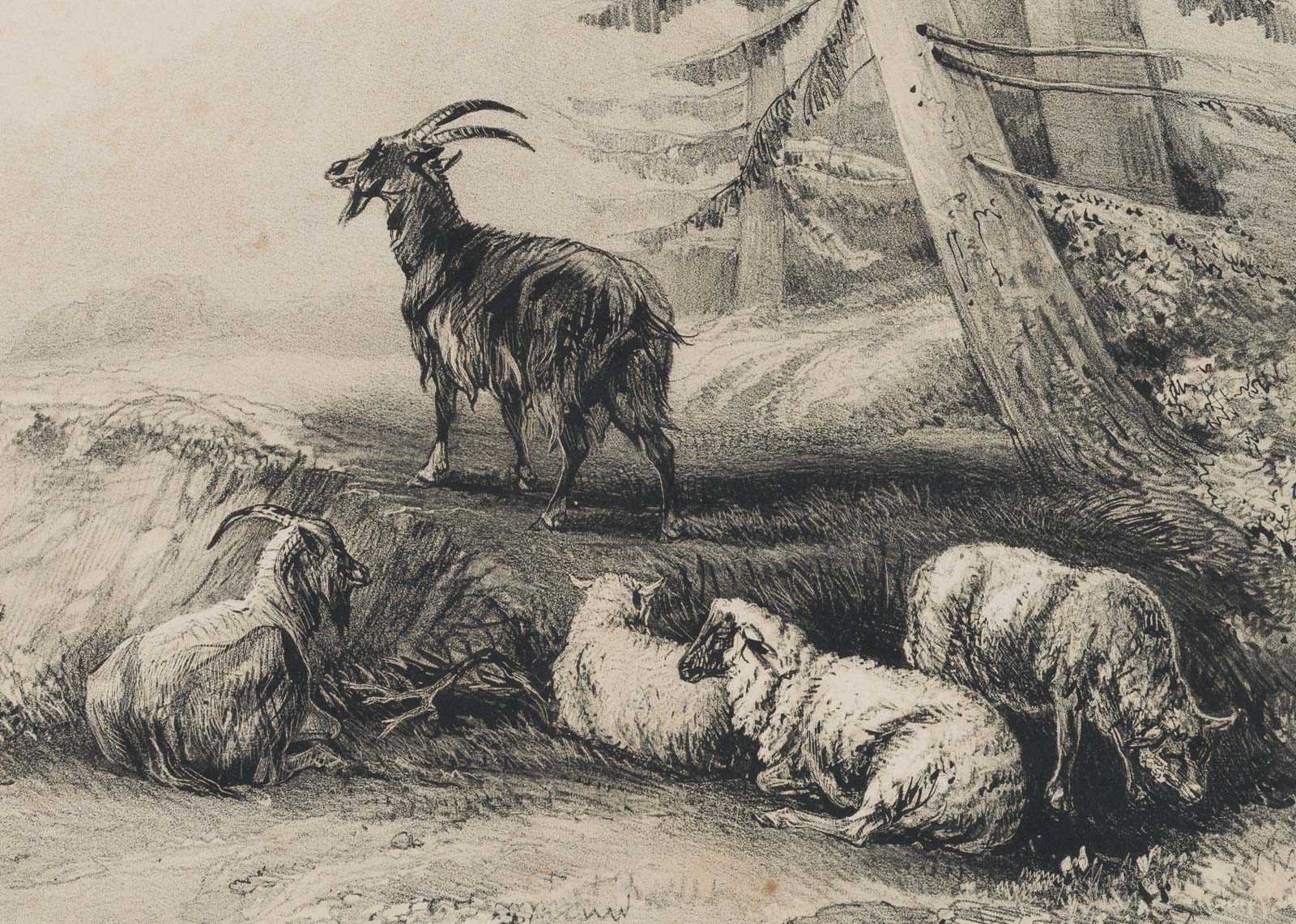 Jean Jacottet (1806 Paris – 1880 ebd.), “Paysages et animaux”, Landschaft mit Tieren, 19. Jahrhundert, Lithographie