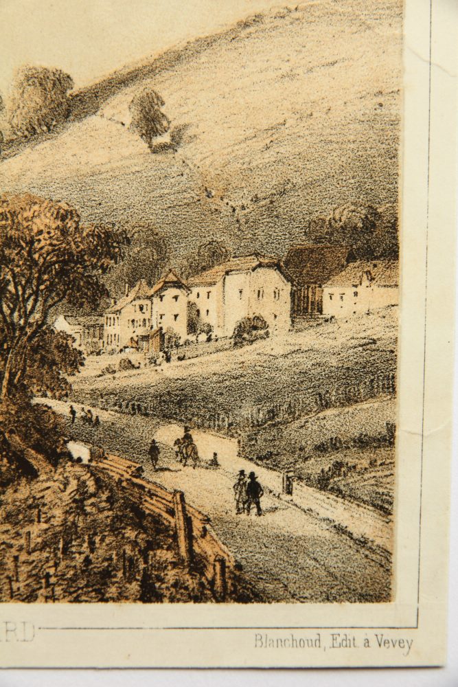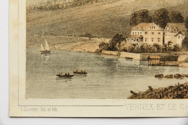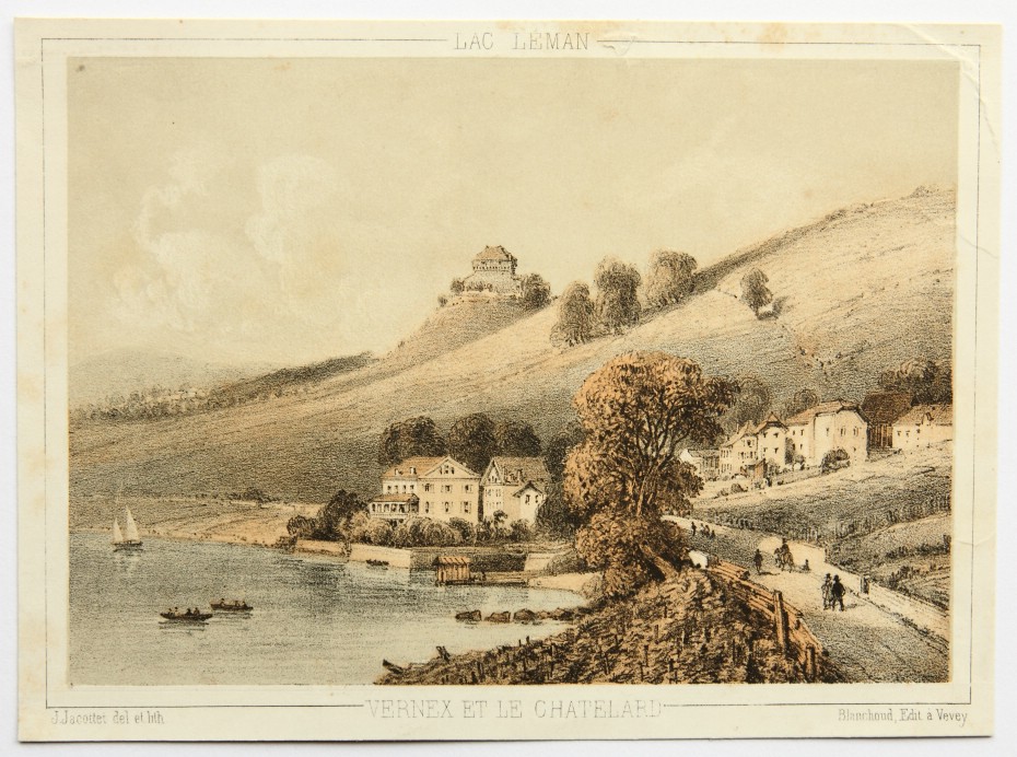Jean Jacottet (1806 Paris – 1880 ibid.), Lake Geneva shore and Chtelard Castle, 19th century, Lithography