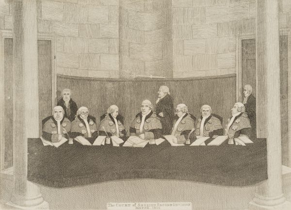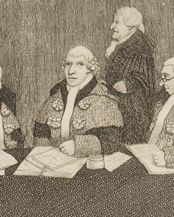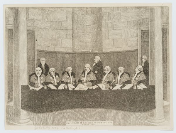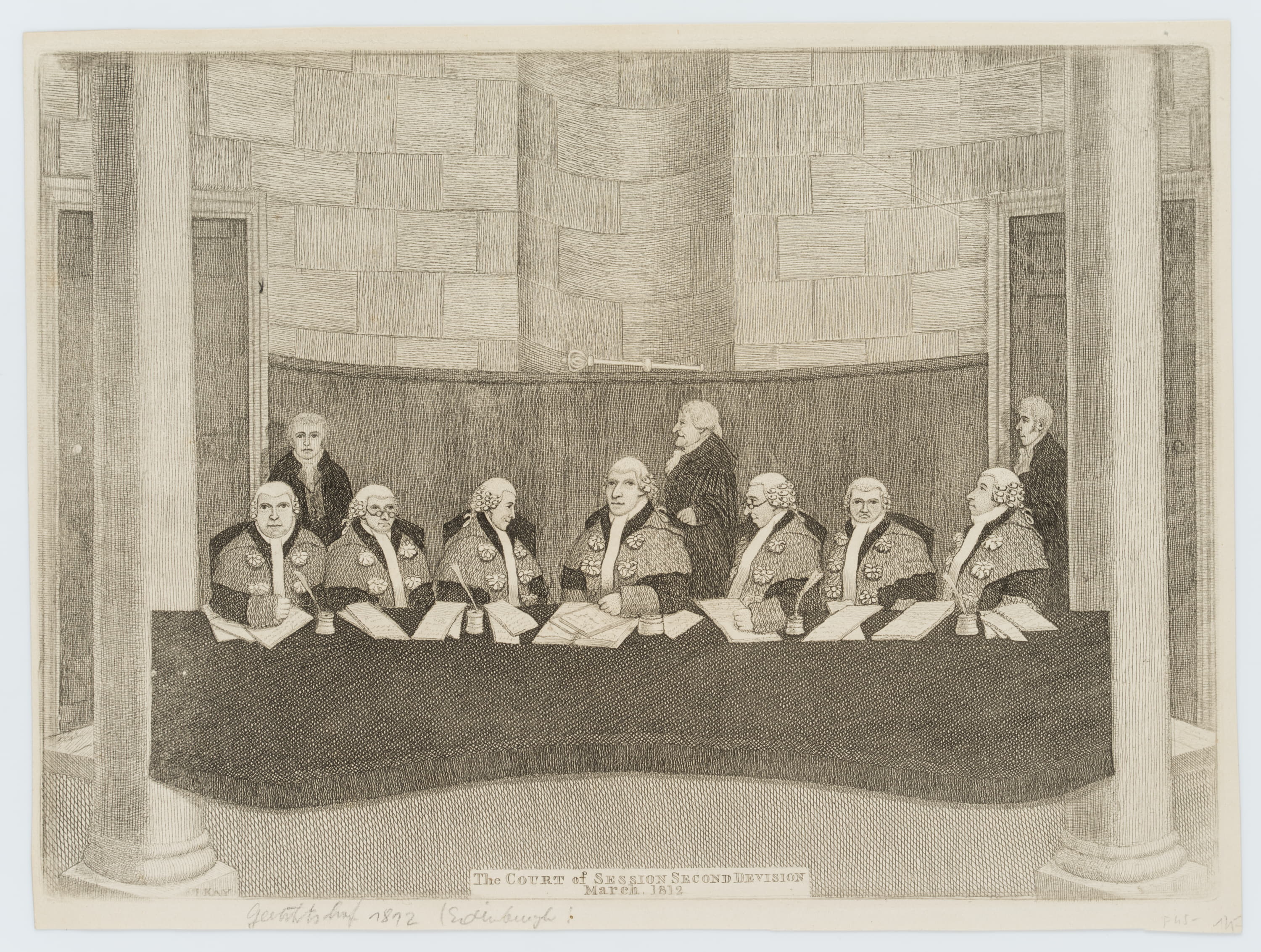 - Description: The illustration shows the senators of the second division of the Inner House of the Court of Session, Scotland’s highest civil court, in the courtroom. The Scottish caricaturist and engraver John Kay, who created the print, was known for his caricatures of events and Edinburgh society.