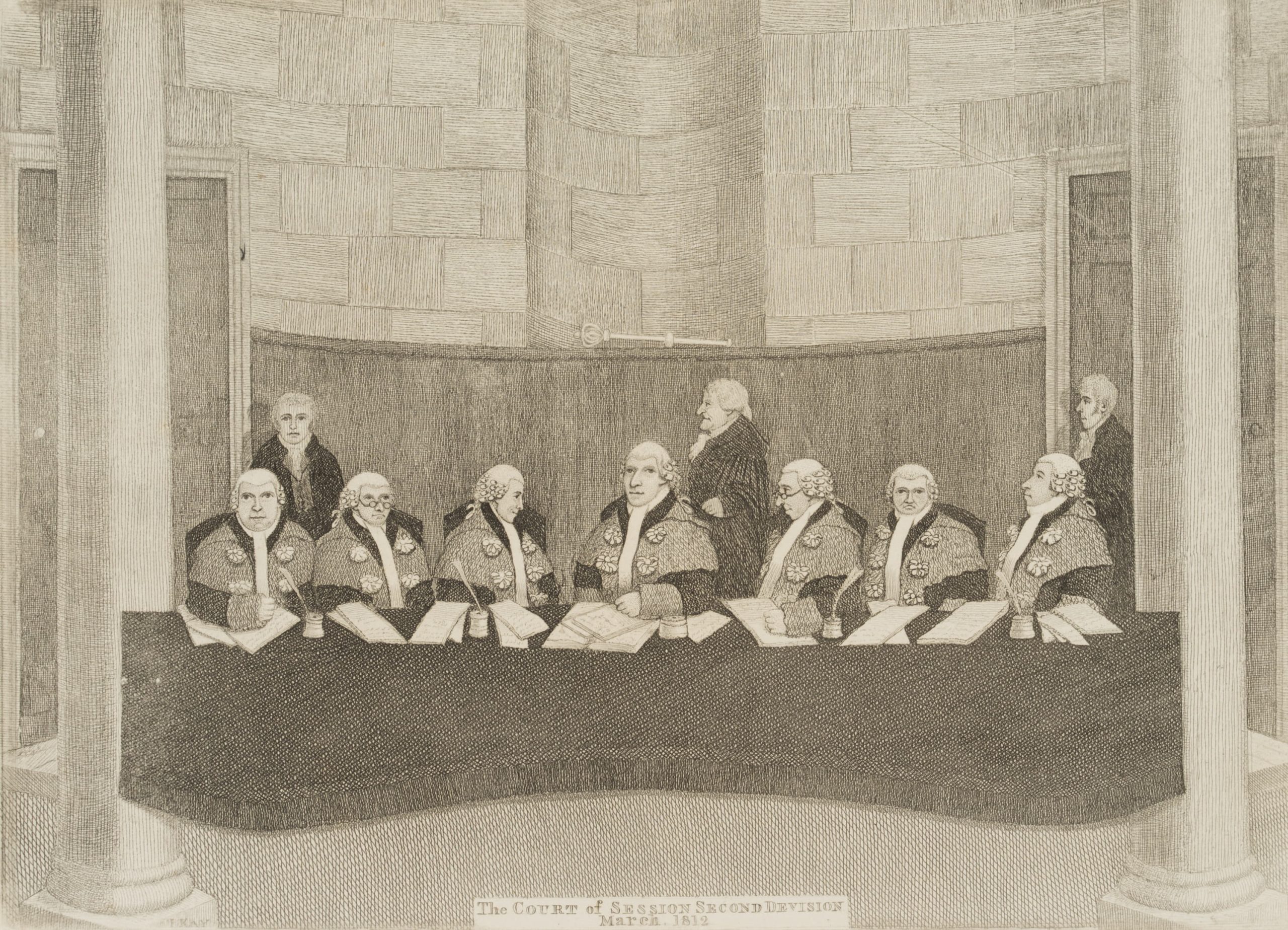 Die Darstellung zeigt die Senatoren des der zweiten Abteilung des Inner House des Court of Session, des höchsten Zivilgerichts Schottlands im Gerichtssaal. Der schottische Karikaturist und Kupferstecher John Kay, von dem das Blatt stammt, war bekannt für seine Karikaturen von Ereignissen und der Gesellschaft Edinburghs.