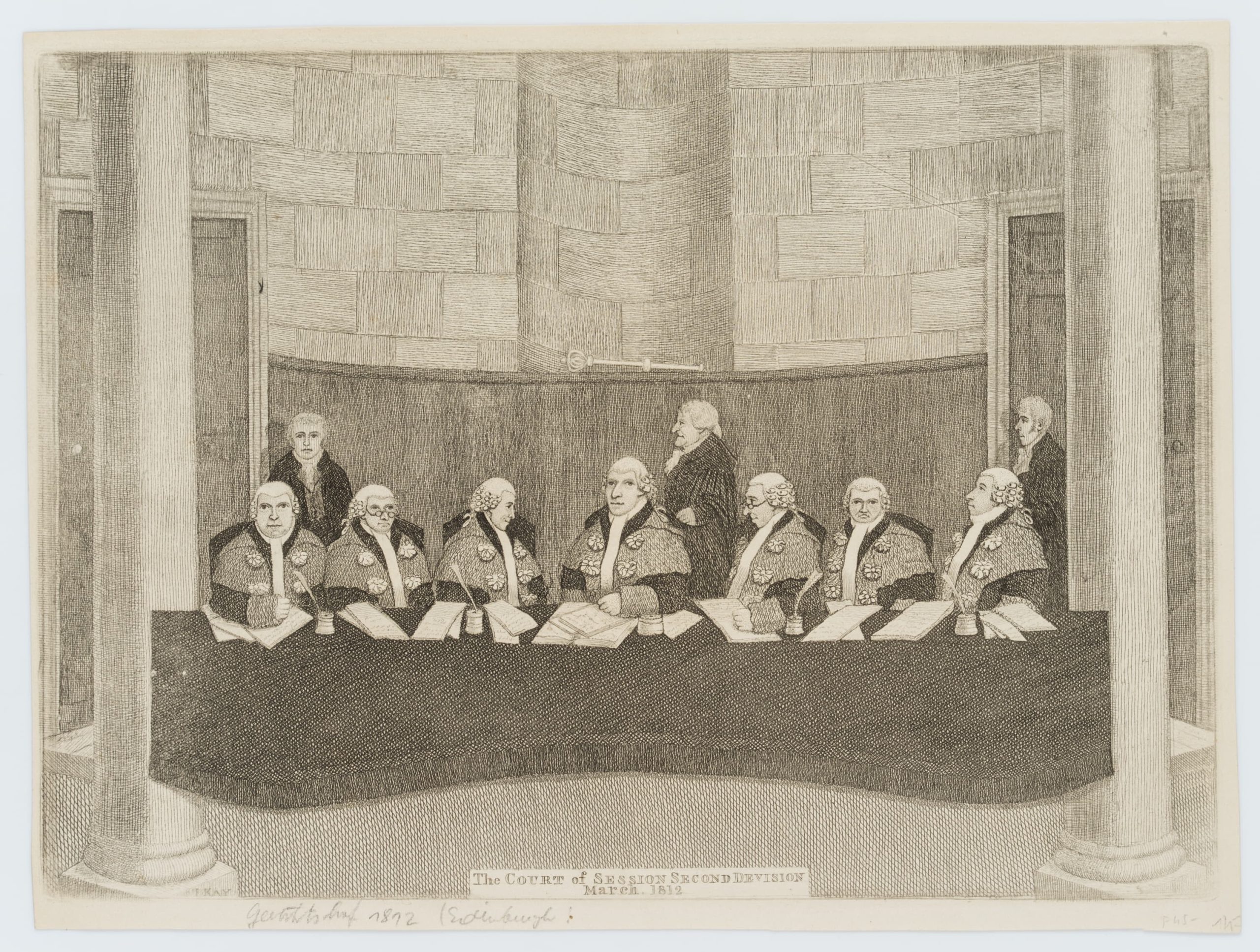 • Inscription: Signed and inscribed at the bottom of the printing plate: “I. KAY | The Court of Session Second Devision March 1812”, inscribed at the bottom in pencil by another hand: “Court of Session 1812 (Edinburgh)”.