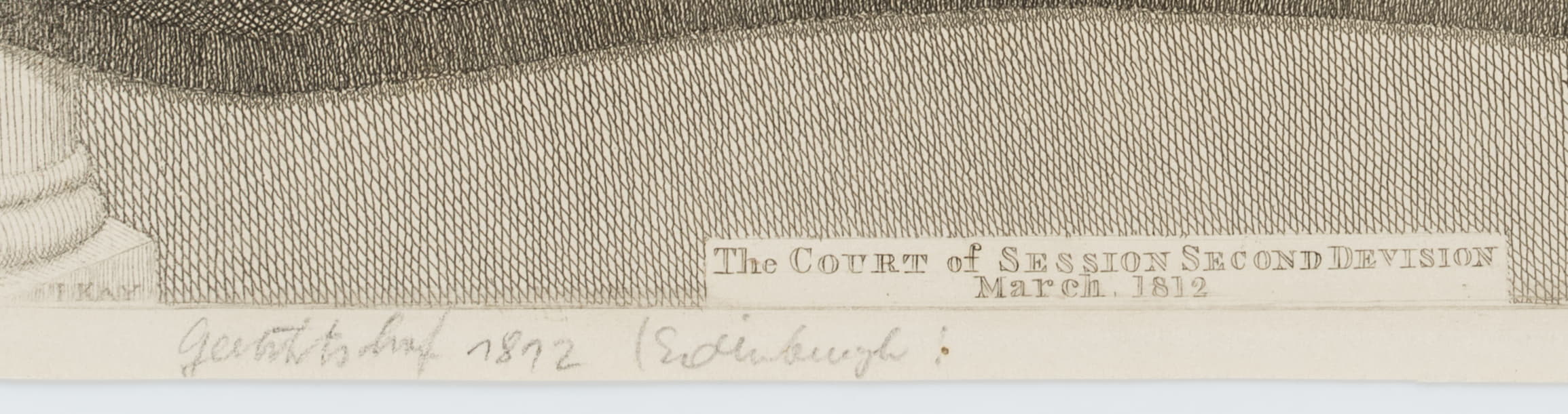 - Inscription: Signed and inscribed at the bottom of the printing plate: “I. KAY | The Court of Session Second Devision March 1812”, inscribed at the bottom in pencil by another hand: “Court of Session 1812 (Edinburgh)”.