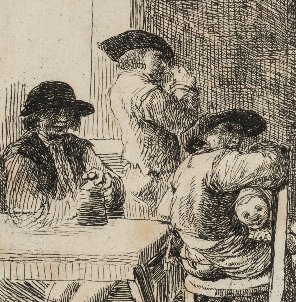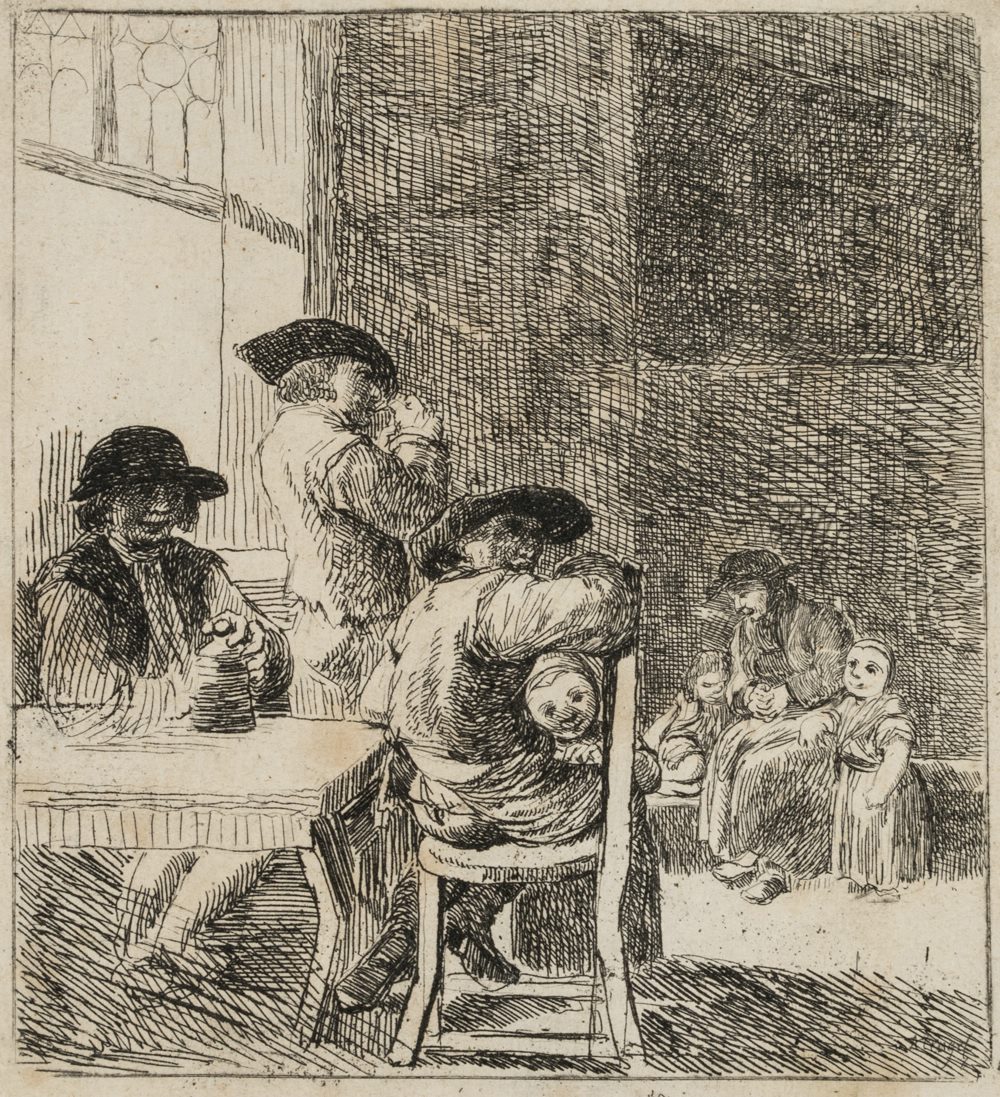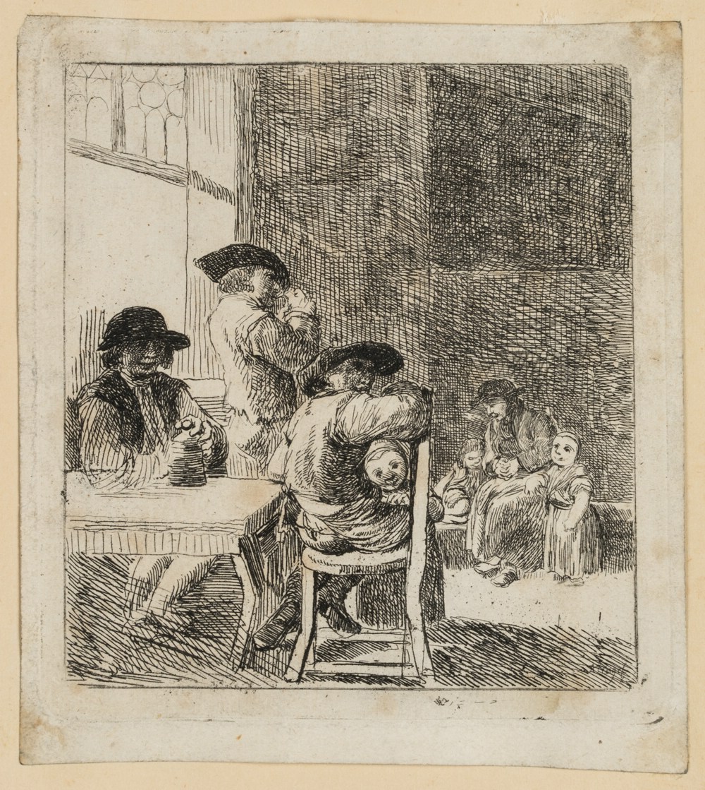- Description: Mounted on cardboard. Genre painting in the parlour of an inn. While two men are sitting at the table, a third is standing at the window looking at a woman with two children. Another child is happily toddling through the room and looks cheekily at the viewer.