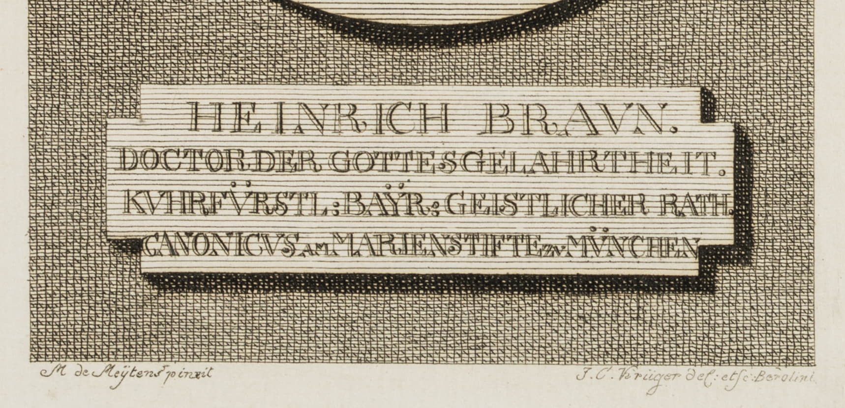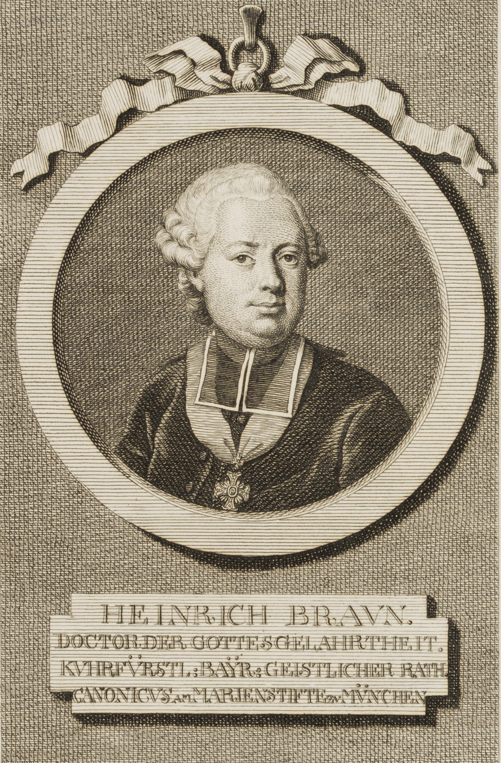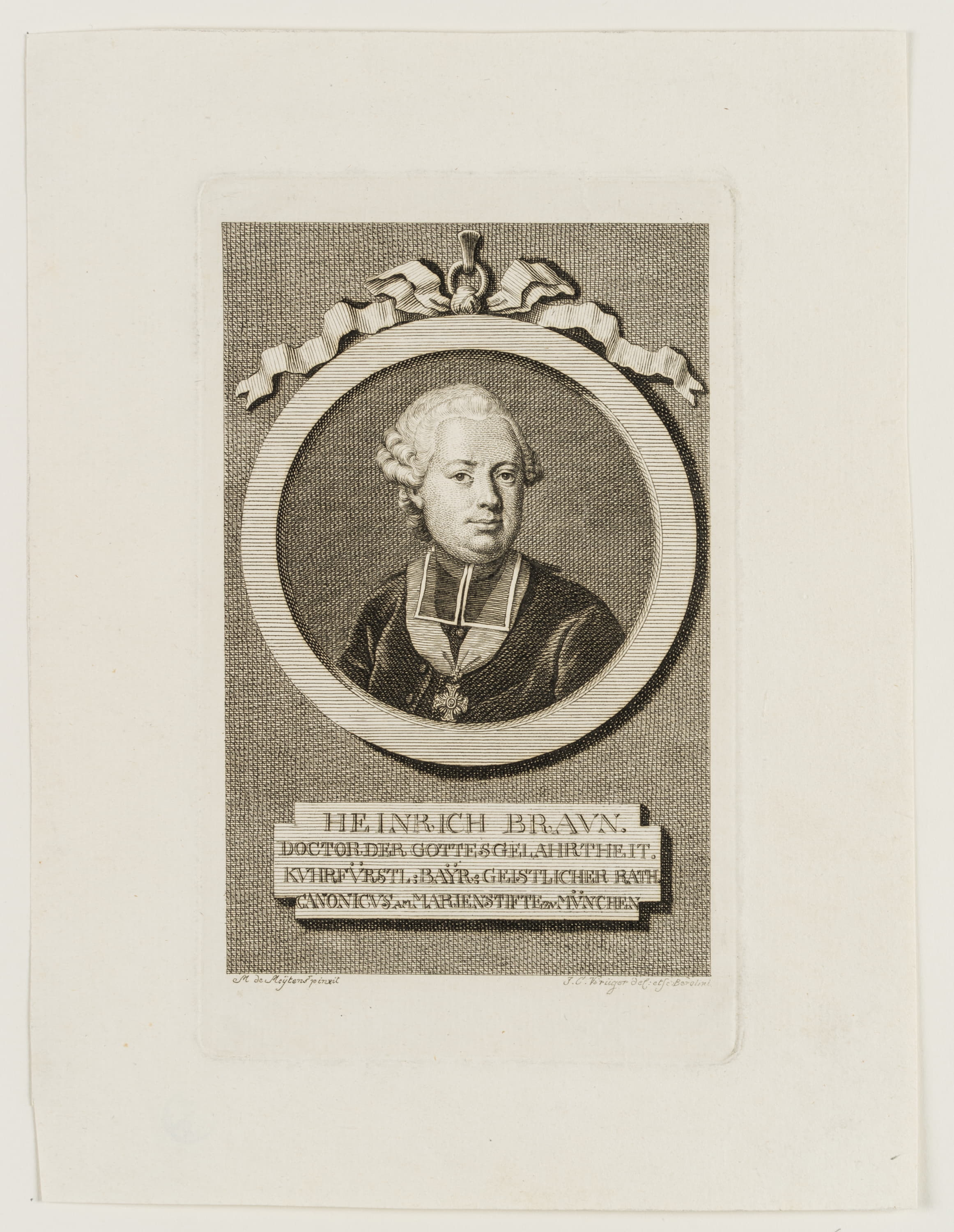 - Description: Bust portrait of the Bavarian school reformer Heinrich Braun after a painting by Martin van Meyten in a medallion with a bow at the upper edge and an inscription plate below. Braun wears a wig and a beffchen, below a medal on a collar.