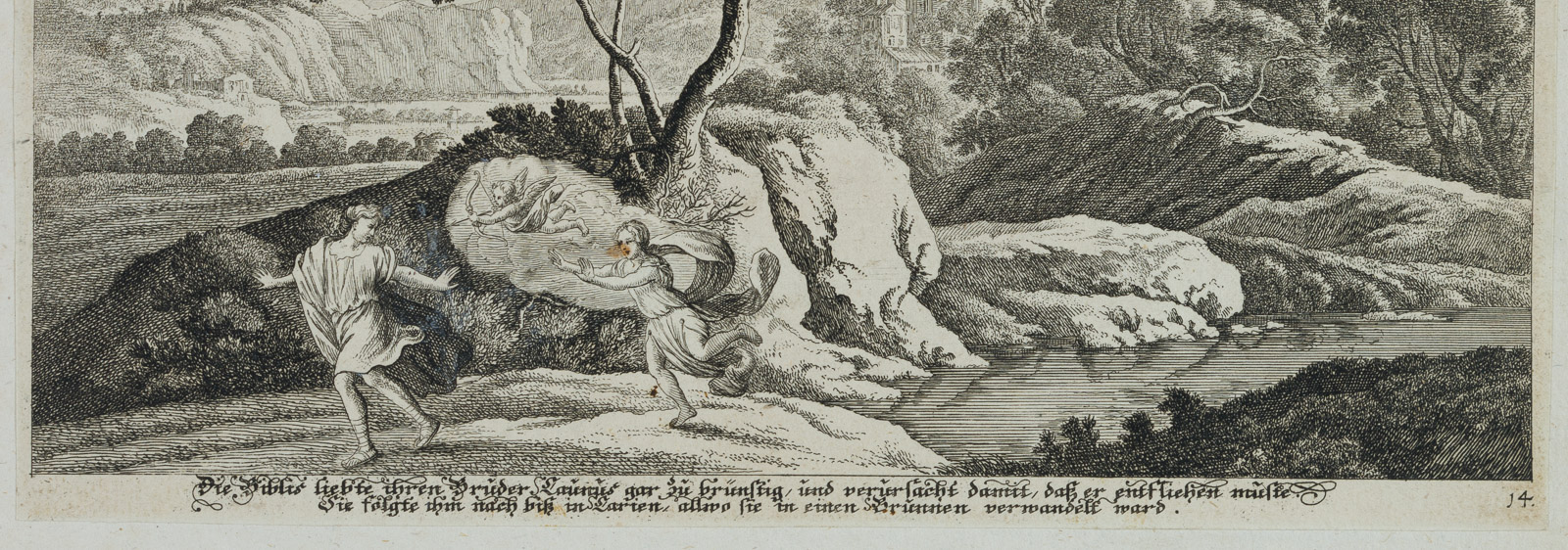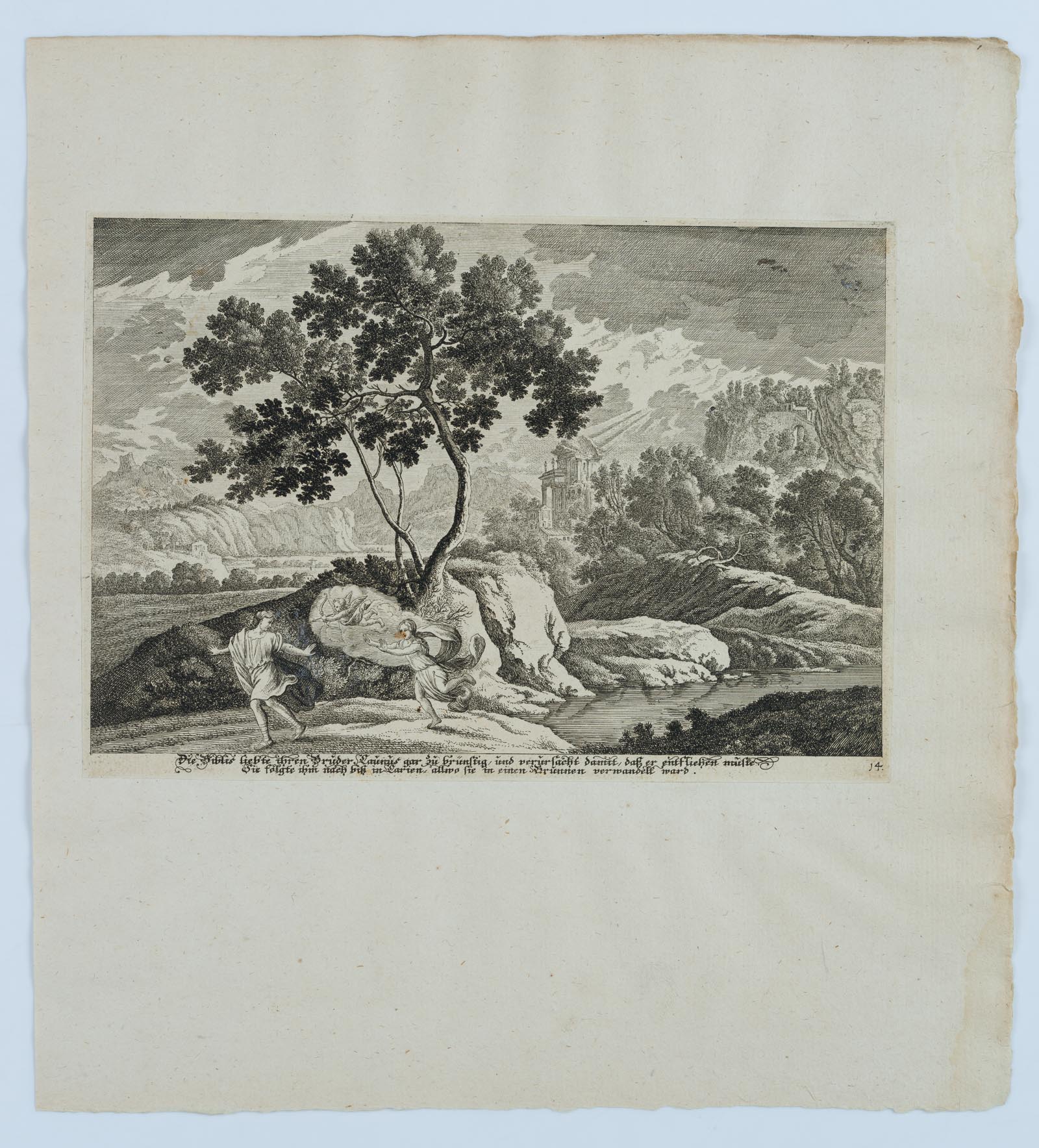 - Bezeichnung: Unterhalb der Darstellung beschriftet. Rechts daneben nummeriert mit “14”. Das Blatt stammt von Johanna Sibylla Küsel und ist Teil einer Reihe von mythologischen Landschaften nach Ovid’s “Metamorphosen”. Johanna Sibylla Küsel (1646-1717), verheiratete Kraus, Tochter des Augsburger Kupferstechers Melchior Küsel. “Zeichner- und Kupferstecherausbildung beim Vater, begabteste und produktivste seiner vier Töchter. Führte nach dessen Tod zwei Jahre den Verlag weiter.