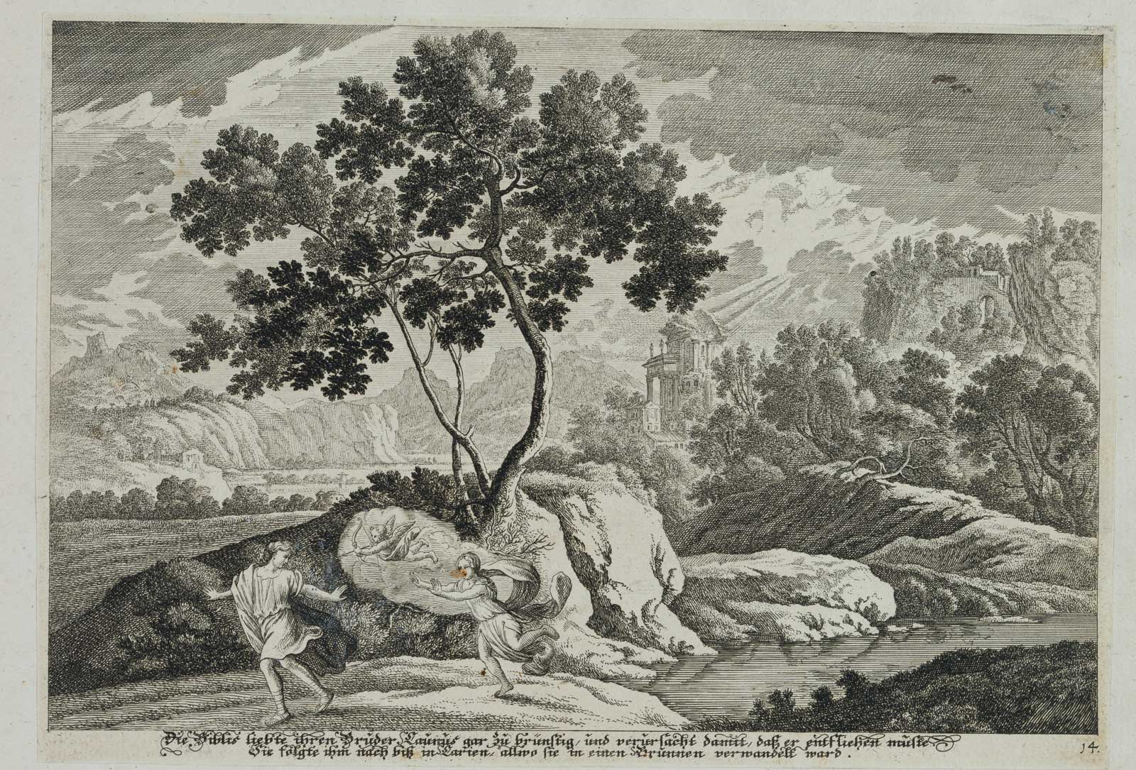 Johanna Sibylla Küsel (around 1650 Augsburg – 1717 ibid.), Heroic landscape with Byblis and Caunus, 18th century, Copper engraving