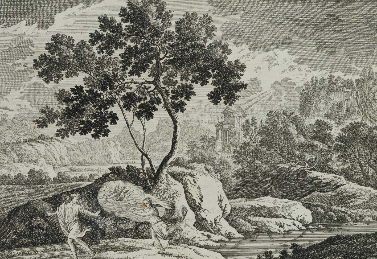 Johanna Sibylla Küsel (um 1650 Augsburg – 1717 ebd.), Heroische Landschaft mit Byblis und Caunus, 18. Jahrhundert, Kupferstich