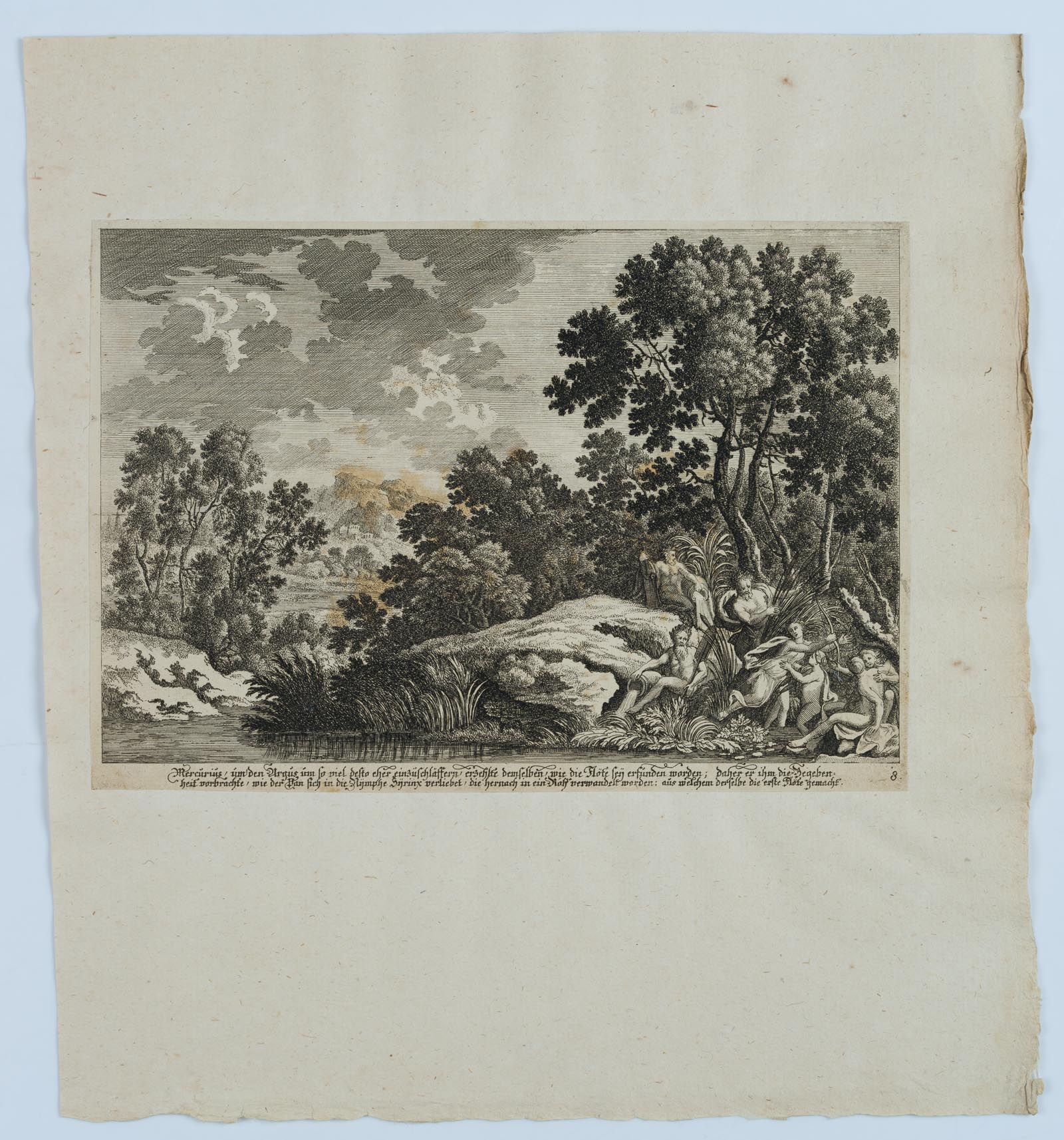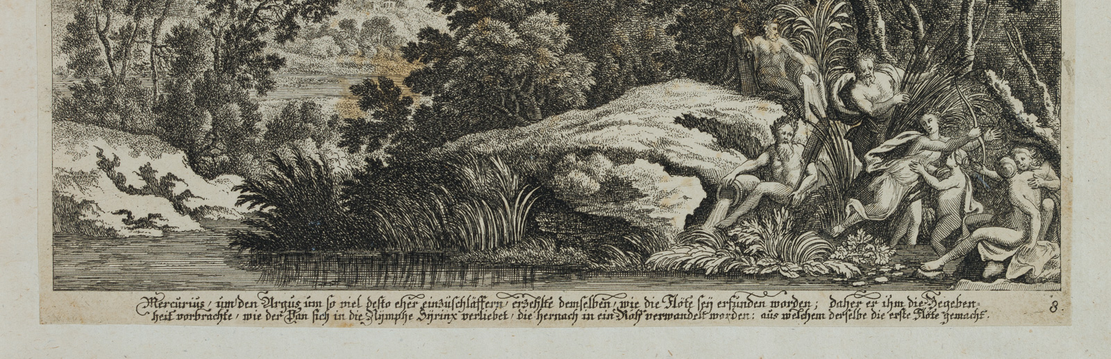 - Bezeichnung: Unterhalb der Darstellung beschriftet. Daneben nummeriert mit “3”. Das Blatt stammt von Johanna Sibylla Küsel und ist Teil einer Reihe von mythologischen Landschaften nach Ovid’s “Metamorphosen”. Johanna Sibylla Küsel (1646-1717), verheiratete Kraus, Tochter des Augsburger Kupferstechers Melchior Küsel. “Zeichner- und Kupferstecherausbildung beim Vater, begabteste und produktivste seiner vier Töchter. Führte nach dessen Tod zwei Jahre den Verlag weiter.