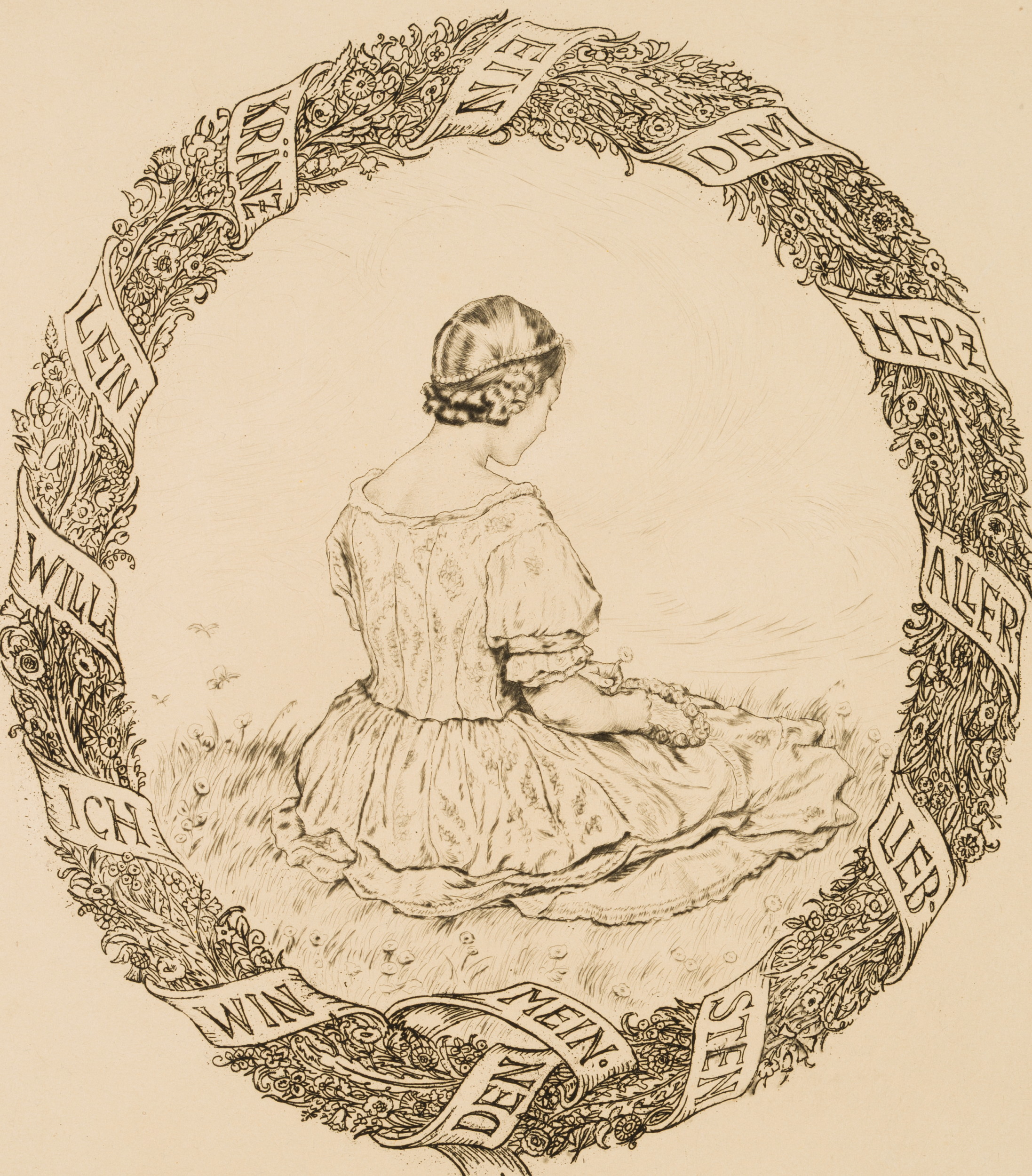 - Inscription: Lower right signed: “I. Kurthen 25”. At the center inscribed: “Ein Kränz-Lein Will Ich Win-Den. Dem Herz Aller Lieb-Sten Mein”.