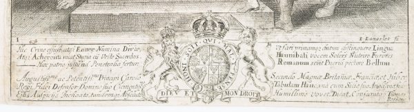 - Inscription: Signed lower right in the image within the printing plate: „L. Lamorlet fe“, numbered lower left in the image: „1“. Within the depiction under rocaille decorations inscribed „D. Manibus“, which appears in funerary inscriptions of Roman antiquity. It only appears in post-Augustan times and, as an inscription without any further addition, generally identifies a place as a burial site or forms part of a funerary inscription.