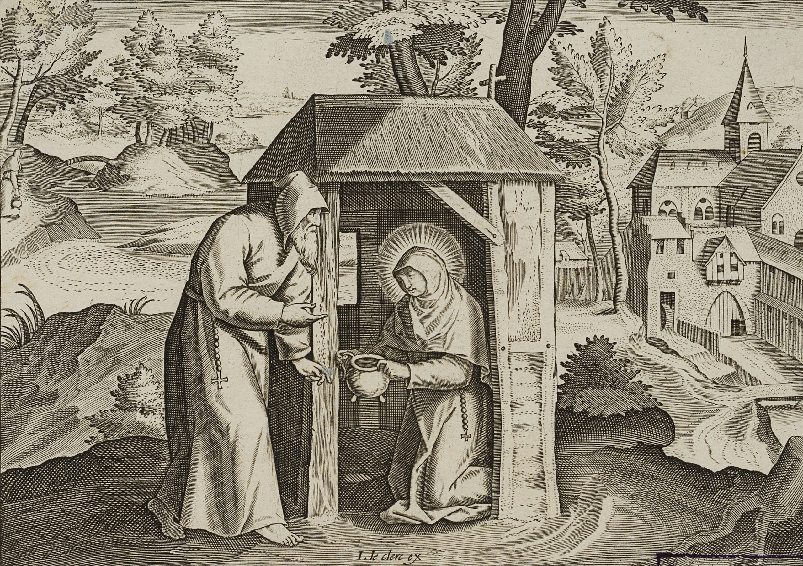 Blatt 15 aus “Solitudo, sive vitae foeminarum anachoritarum”, (gestochener Titel und 24 Tafeln, um 1600/20), das hauptsächlich spiegelverkehrte Kopien nach Stichen von Adriaen Collaert und Jan Sadeler I, nach Marten de Vos enthält.
