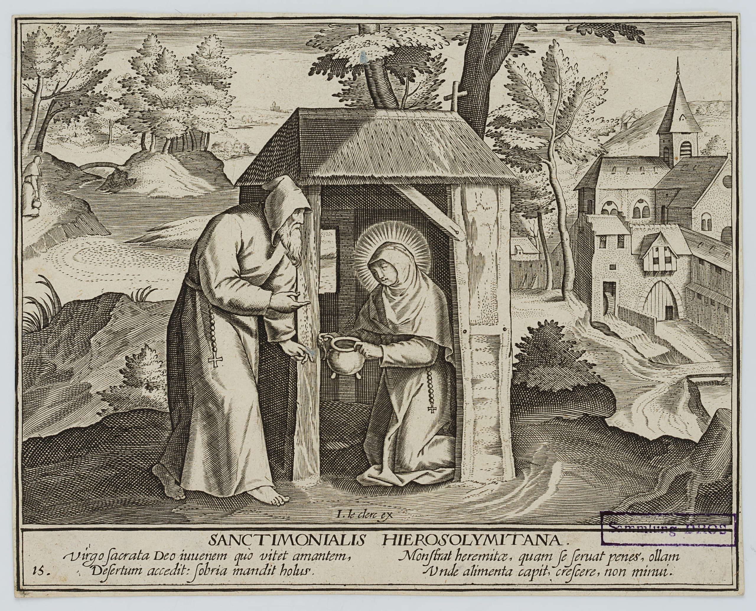 • Beschreibung: Blatt 15 aus “Solitudo, sive vitae foeminarum anachoritarum”, (gestochener Titel und 24 Tafeln, um 1600/20), das hauptsächlich spiegelverkehrte Kopien nach Stichen von Adriaen Collaert und Jan Sadeler I, nach Marten de Vos enthält.