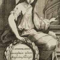 - Description: Ornamental engraving; laterally reversed copies after J. le Pautre, published by Pieter Schenk (1660-1715), Amsterdam. Inscribed in the centre below the depiction: “Sacra Dogmata plebem E docet”. Inscribed within the cartouche: “CATHEDRARUM/ exempla, in usum/ Artificum studios/ COLLECTA”.