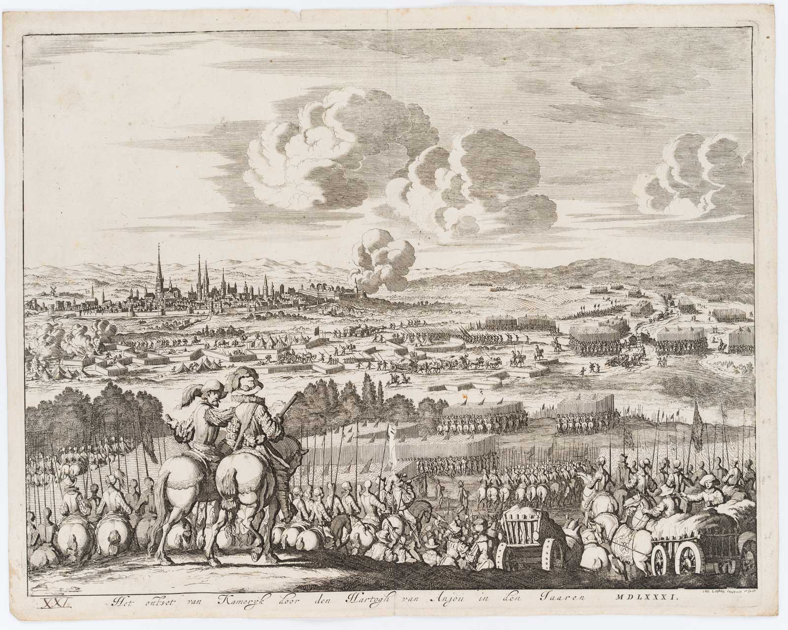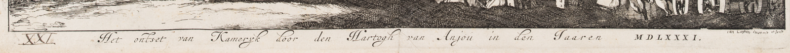 • Inscription: Signed on the right below the print with “Jan Luyken invenit et fecit”, inscribed and numbered below with “XXI | Het ouset van Kameryk door den hartogh van Anjou in den Jaaren MDLXXXI.”.