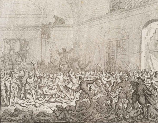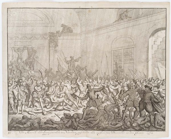 - Inscription: Signed on the right below the print with “J. Luyken invenit et fecit”. Below inscribed in Dutch and numbered “VI De Moordt der Spanjaerden te Naerden geschiedt den eersten van December in den Jaare 1572”.
