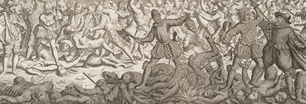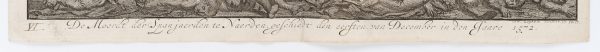 - Bezeichnung: Rechts unterhalb der Graphik signiert mit “J. Luyken invenit et fecit”. Darunter hölländisch beschriftet und nummeriert mit “VI De Moordt der Spanjaerden te Naerden geschiedt den eersten van December in den Jaare 1572”.