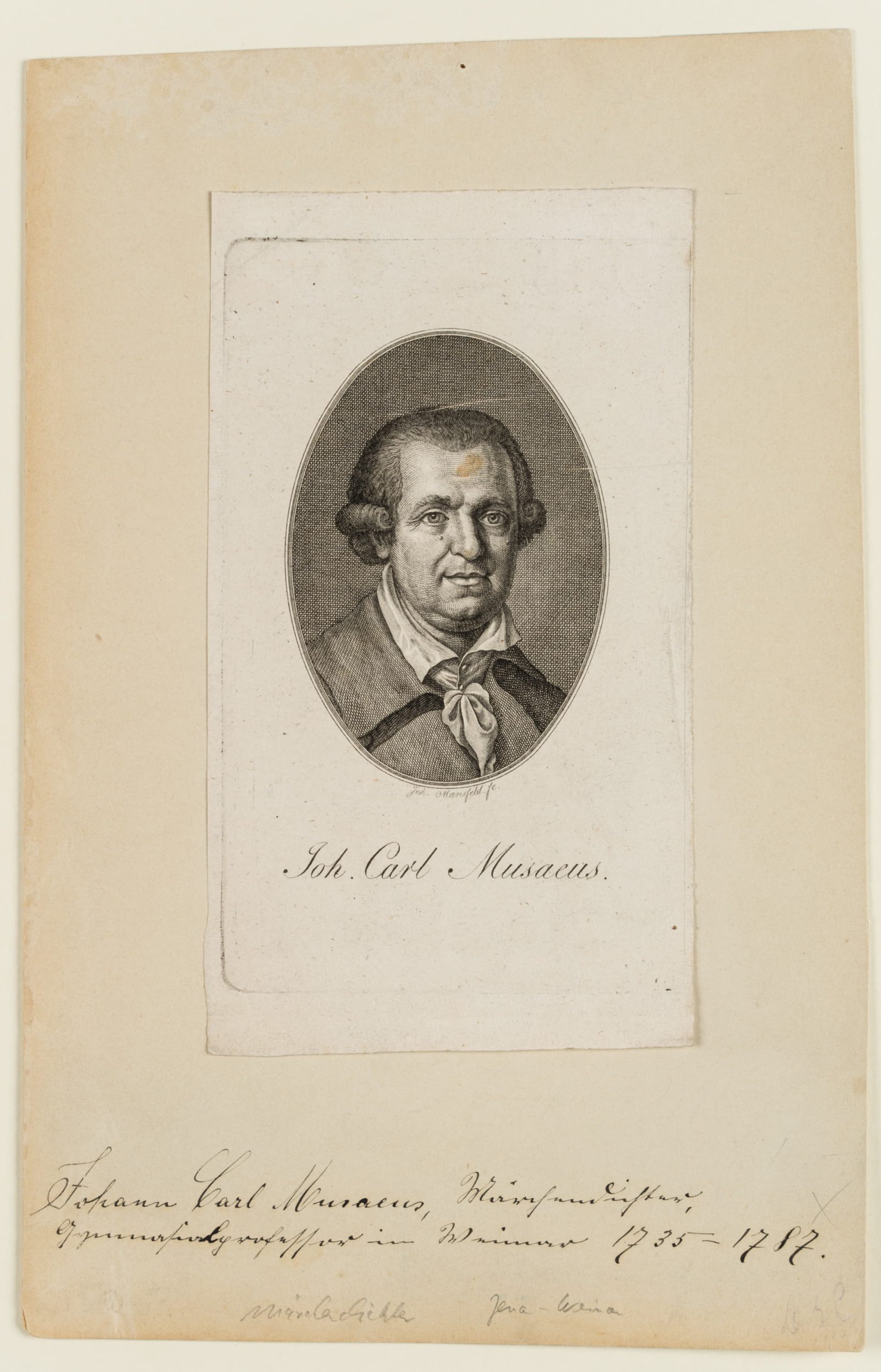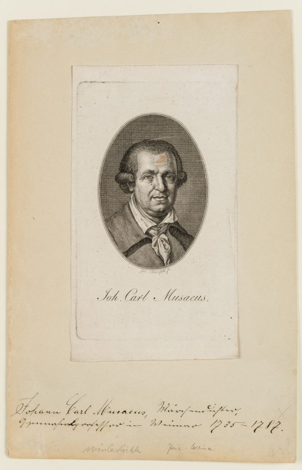 - Description: Half-length portrait of the German writer and collector of German sagas and fairy tales Musäus in three-quarter profile to the right with curls of hair at the side patricide collar and neck tie.