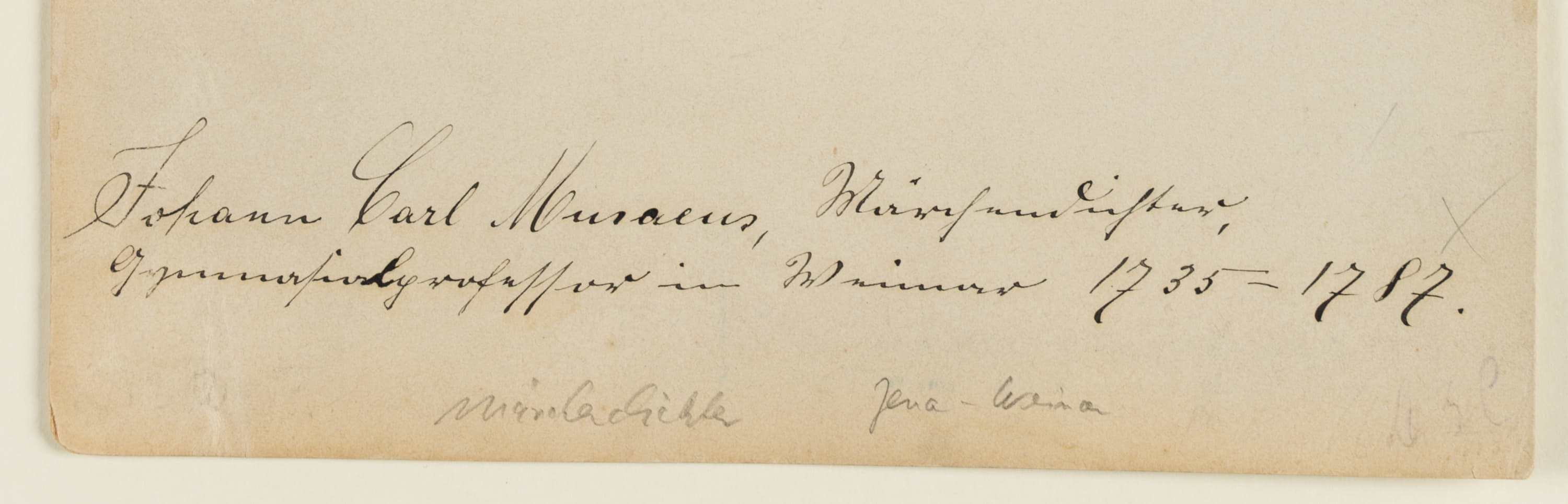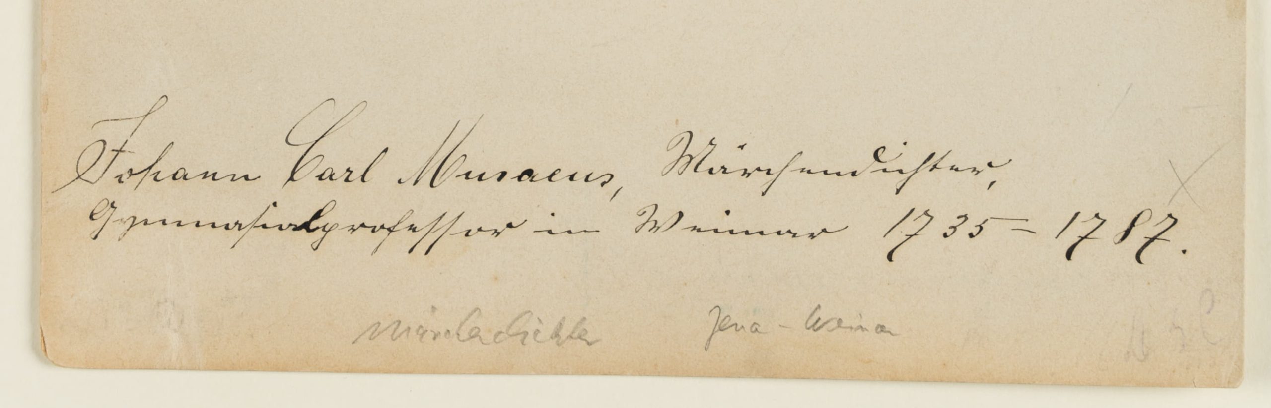 - Bezeichnung: Unterhalb der Darstellung in der Druckplatte signiert und bezeichnet: “Joh. Mansfeld sc. | Joh. Carl Musaeus.”, auf der Unterlage von fremder Hand in Tusche bezeichnet