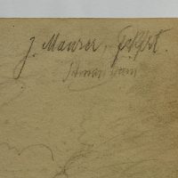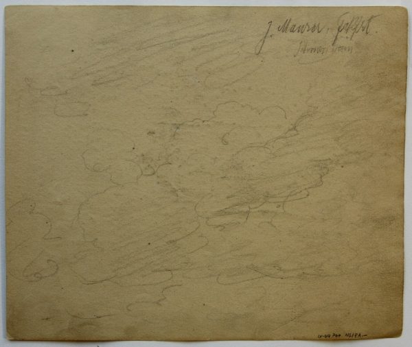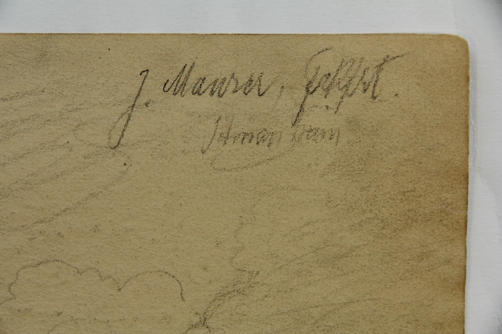 - Beschreibung: Rückseitig befindet sich eine weitere skizzenhafte Zeichnung sowie die Signatur des Künstlers(?).