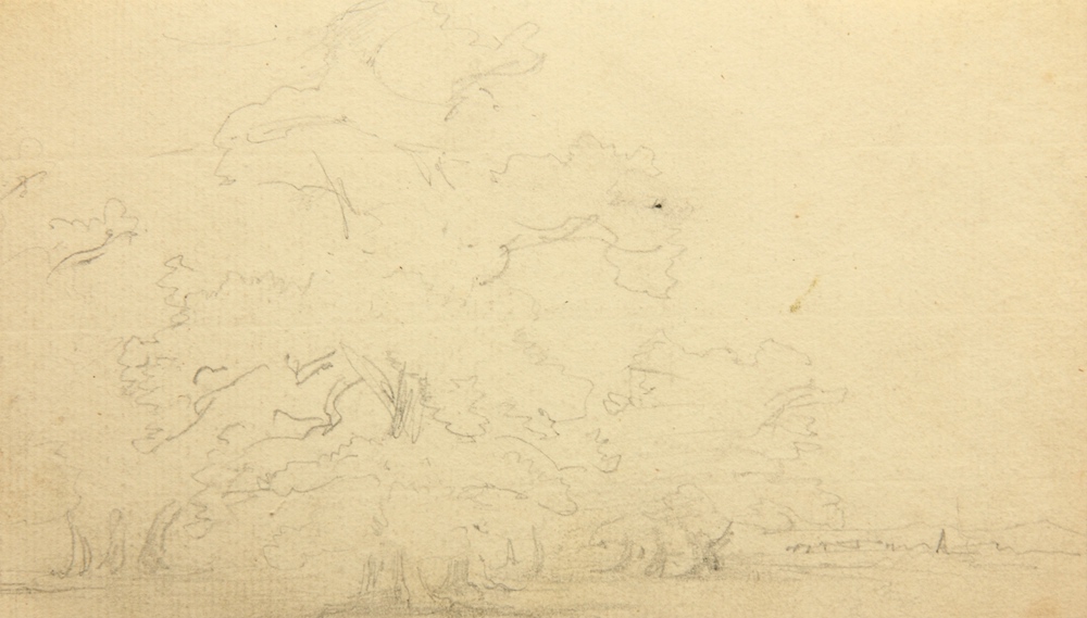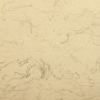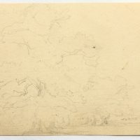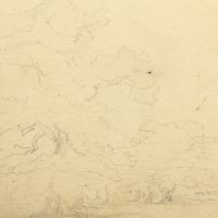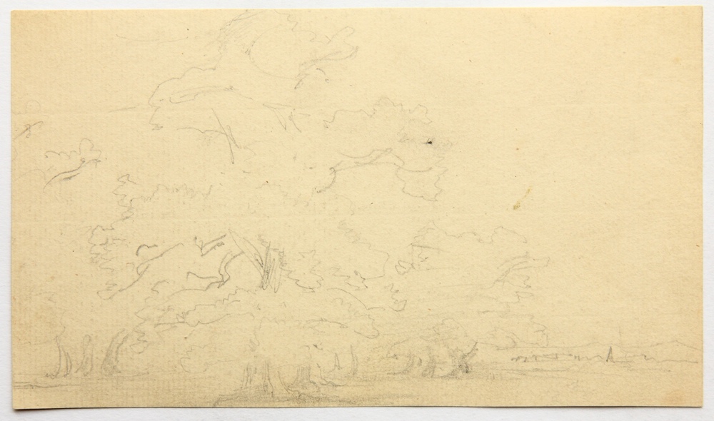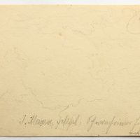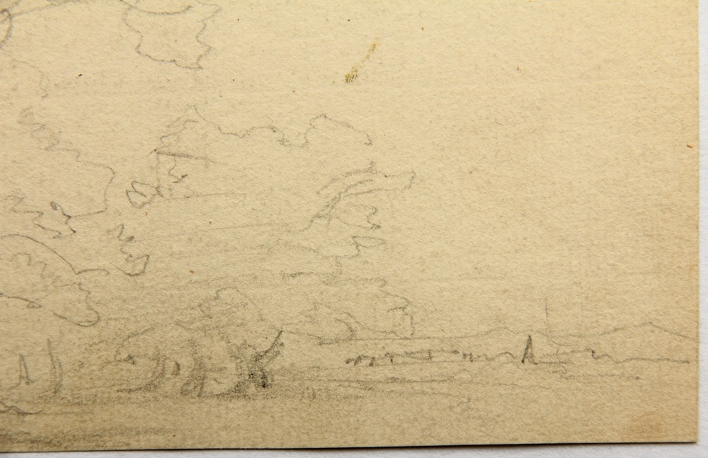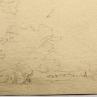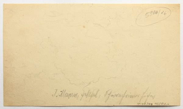 - Beschreibung: Skizzenhafte Naturdarstellung mit Ausblick auf die Silhouette einer fernen Ortschaft mit markantem Kirchturm. Rückseitig befindet sich eine kaum erkennbare Darstellung sowie die Signatur des Künstlers mit unkenntlicher Bezeichnung: “Frankfurt[?][.]”.