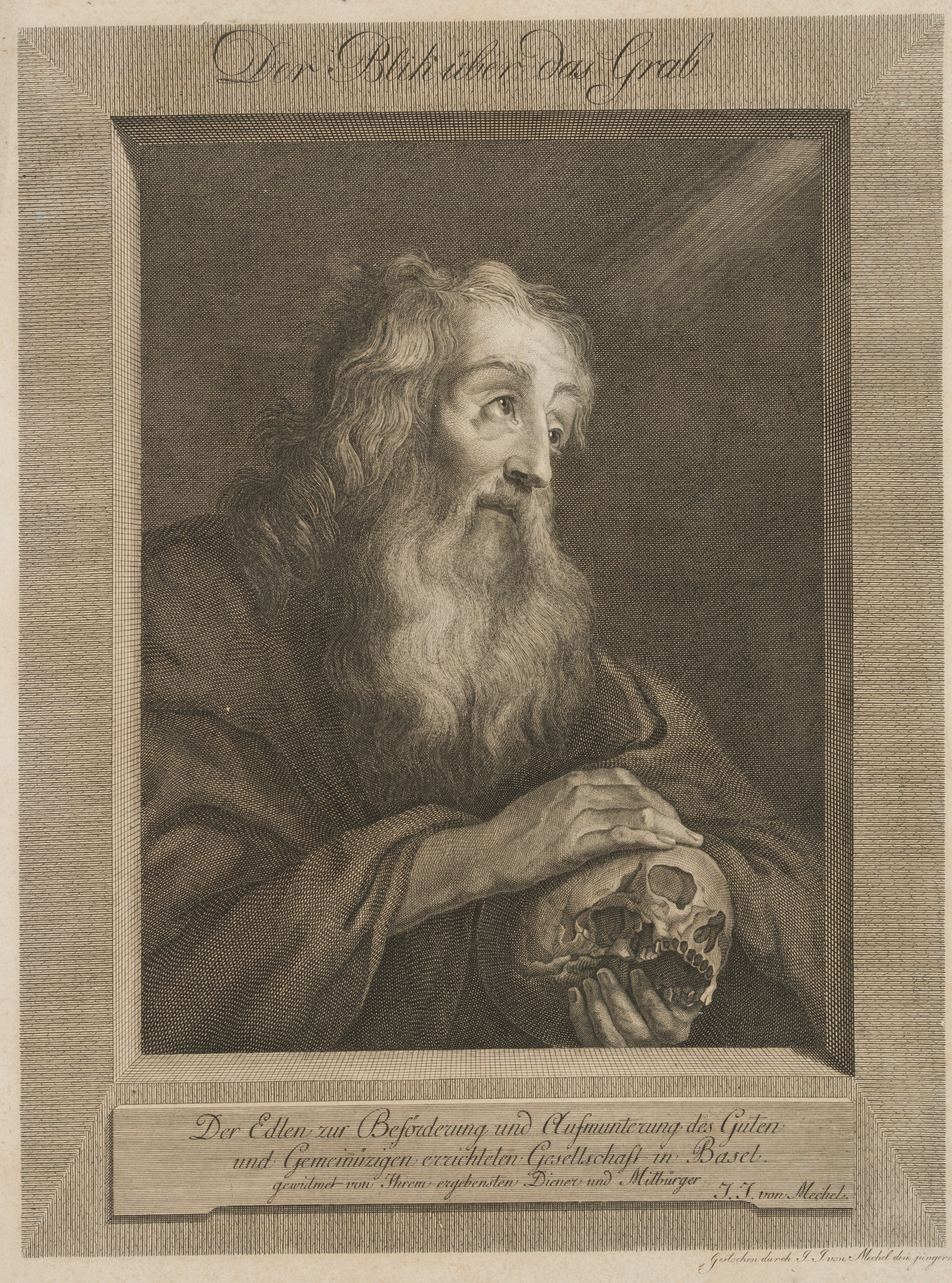 Johann Jakob von Mechel (1764 Basel – 1816 ebd.), Der Blick über das Grab. Heiliger Hieronymus mit Schädel, , Kupferstich