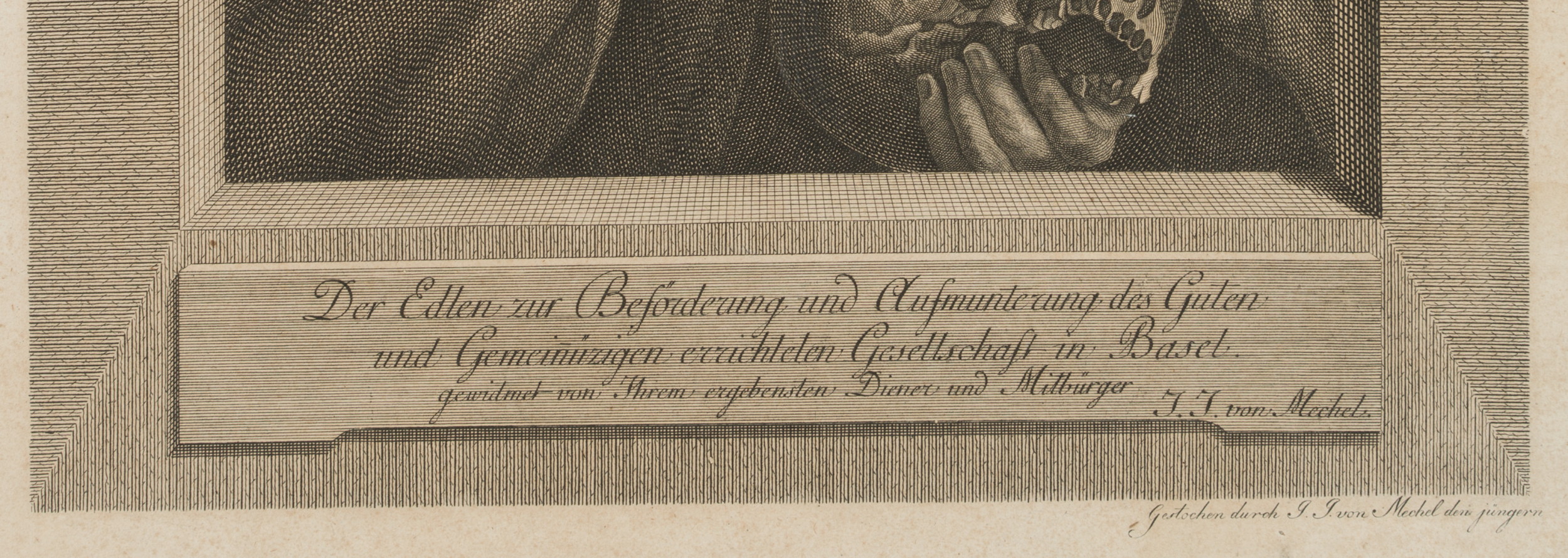 - Bezeichnung: Unten rechts im Druck signiert: “Gestochen durch J. J. von Mechel dem jüngern”. Im Druck bezeichnet: “Der Blick über das Grab / Der Edlen zur Beförderung und Aufmunterung des Guten und Gemeinüzigen errichteten Gesellschaft in Basel [..]”.