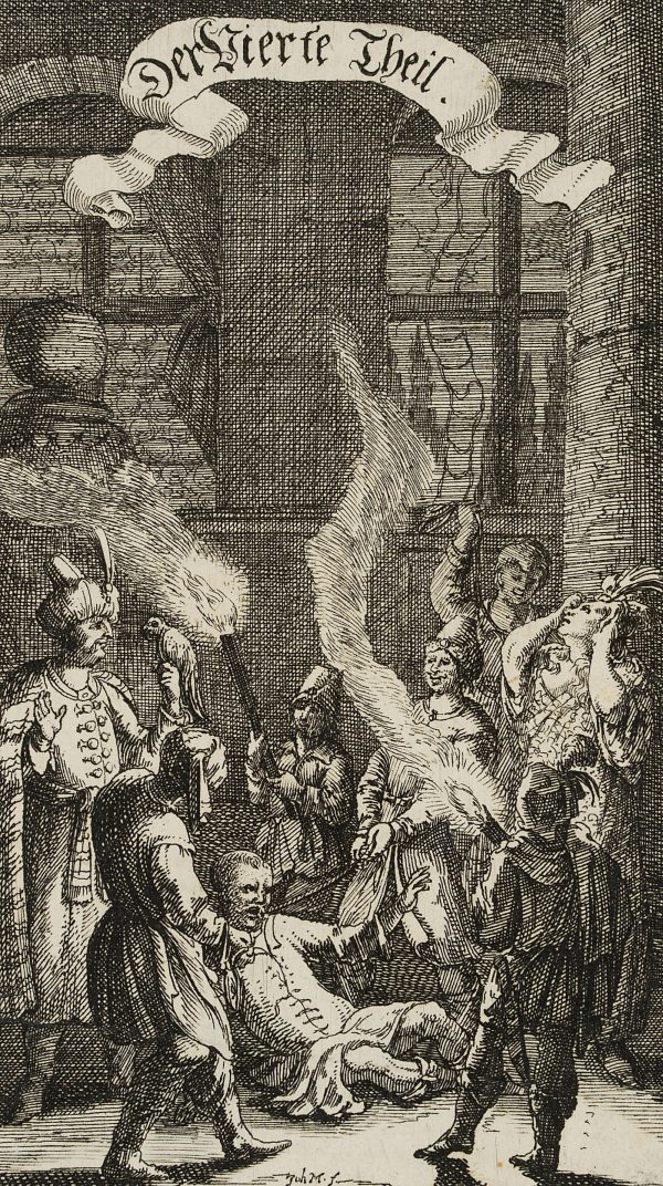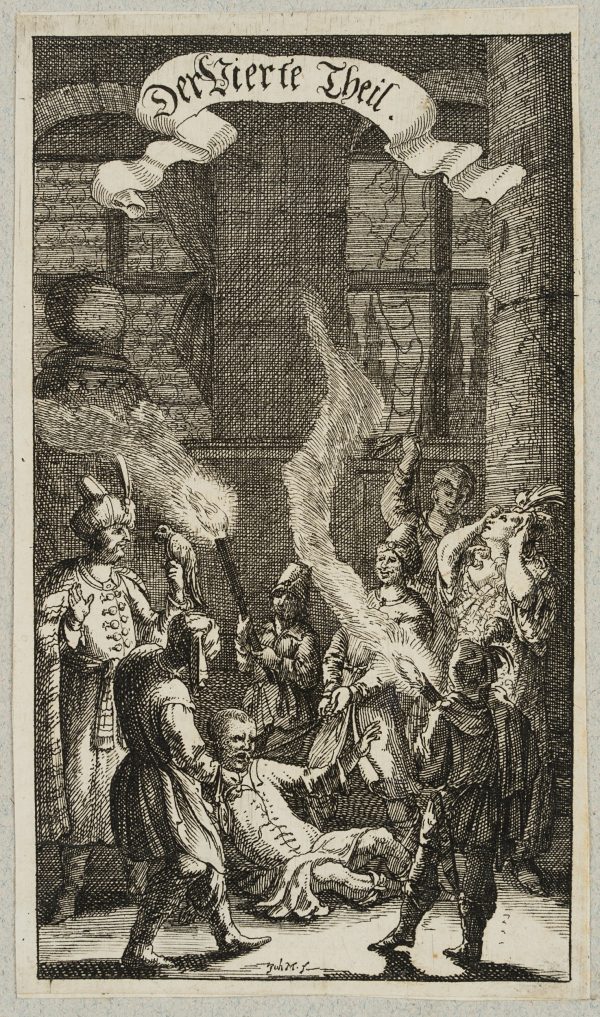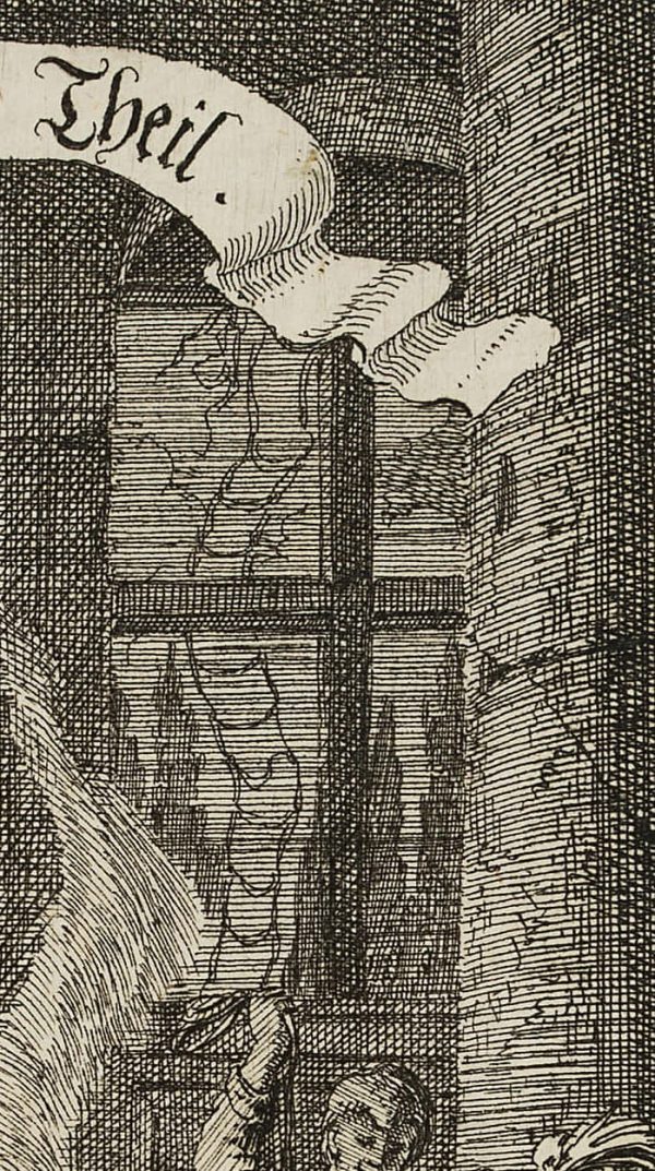 - Inscription: Lower middle signed in the printing plate: “Joh M. f”. At the upper part inscribed in the printing plate: “Der Vierte Theil”.