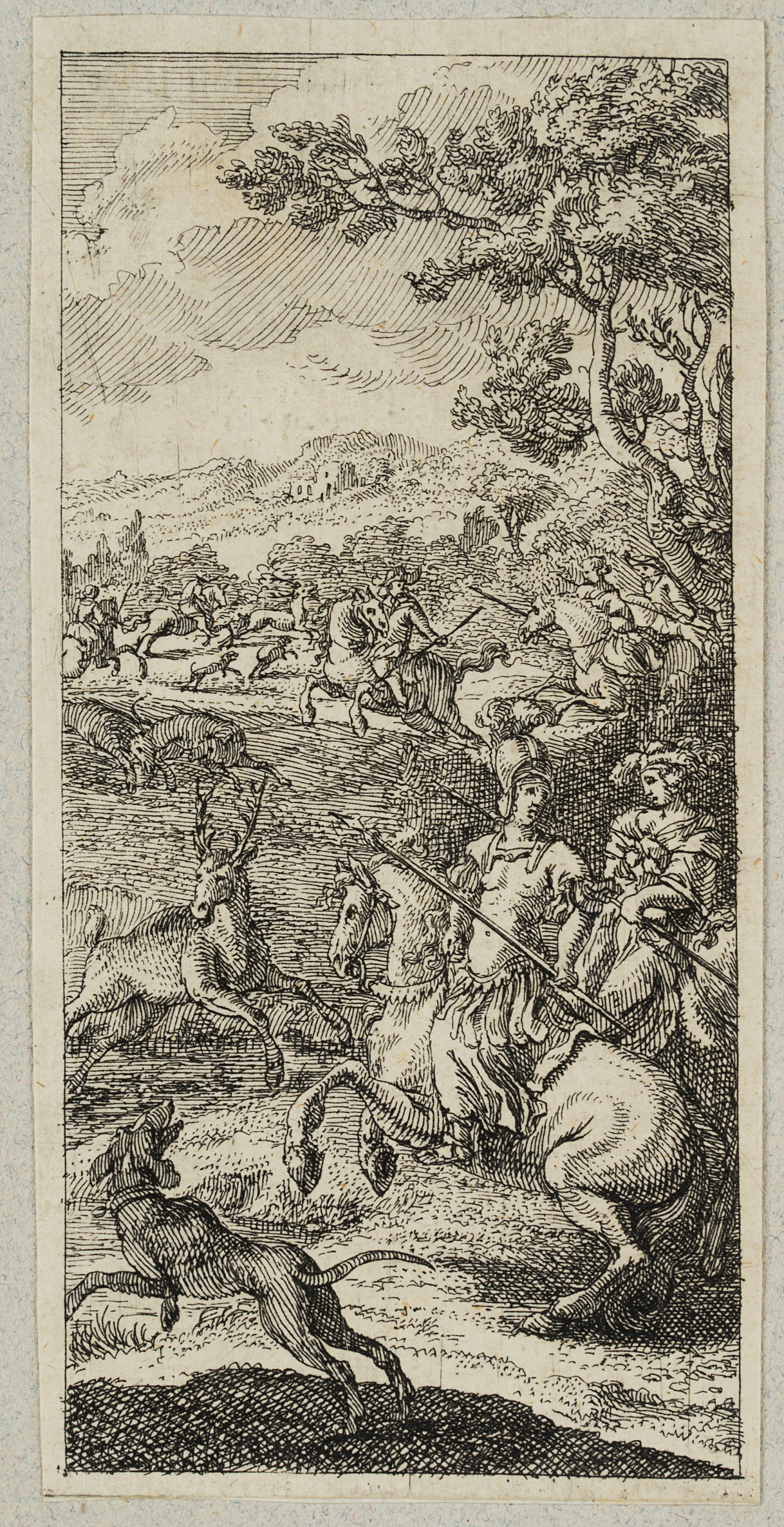 Johannes Meyer d. J. (1655 Zürich – 1712 ebd.), Reiter zur Hirschjagd, , Radierung