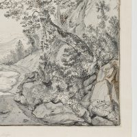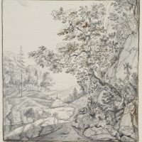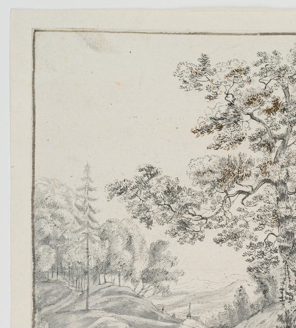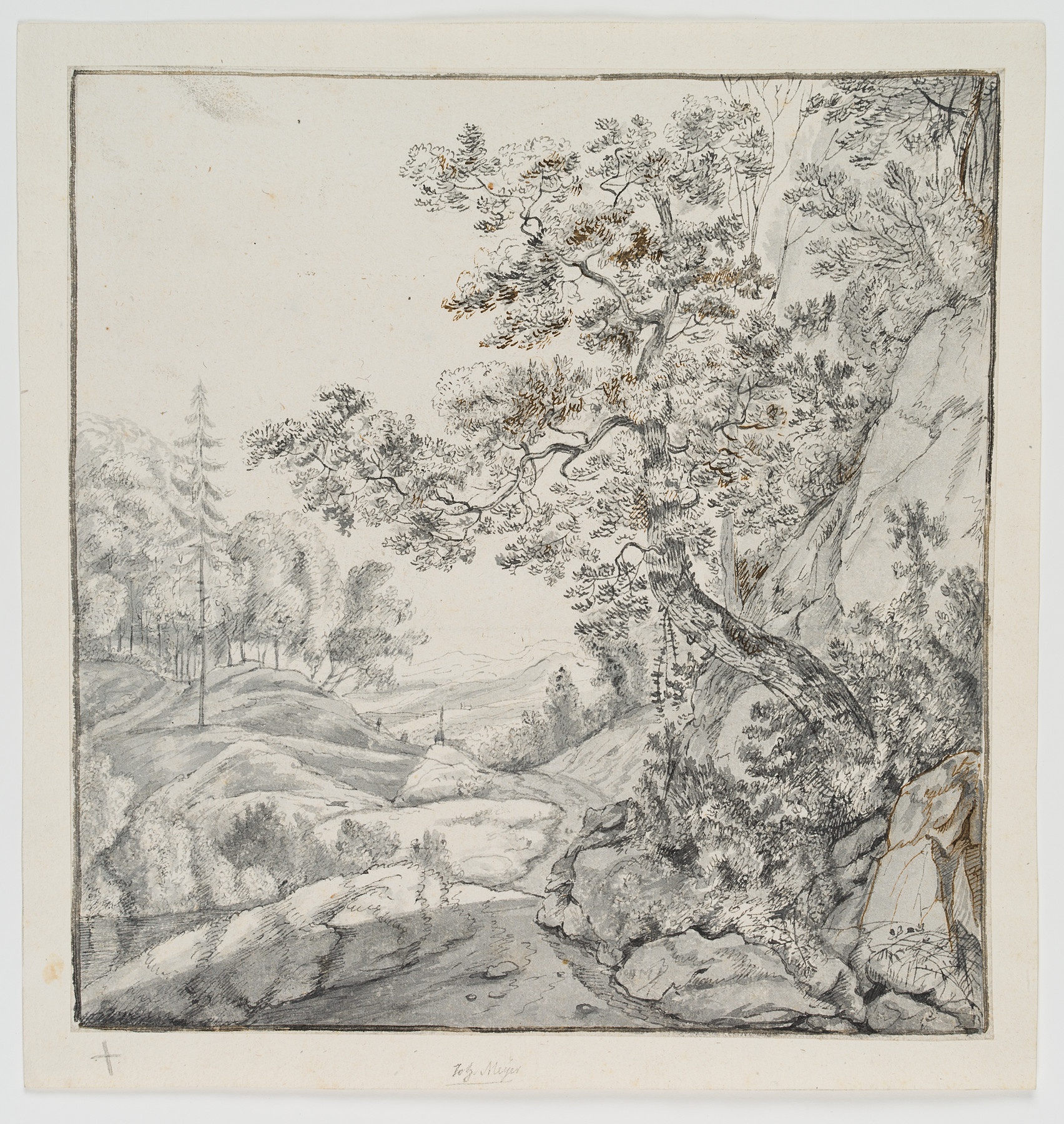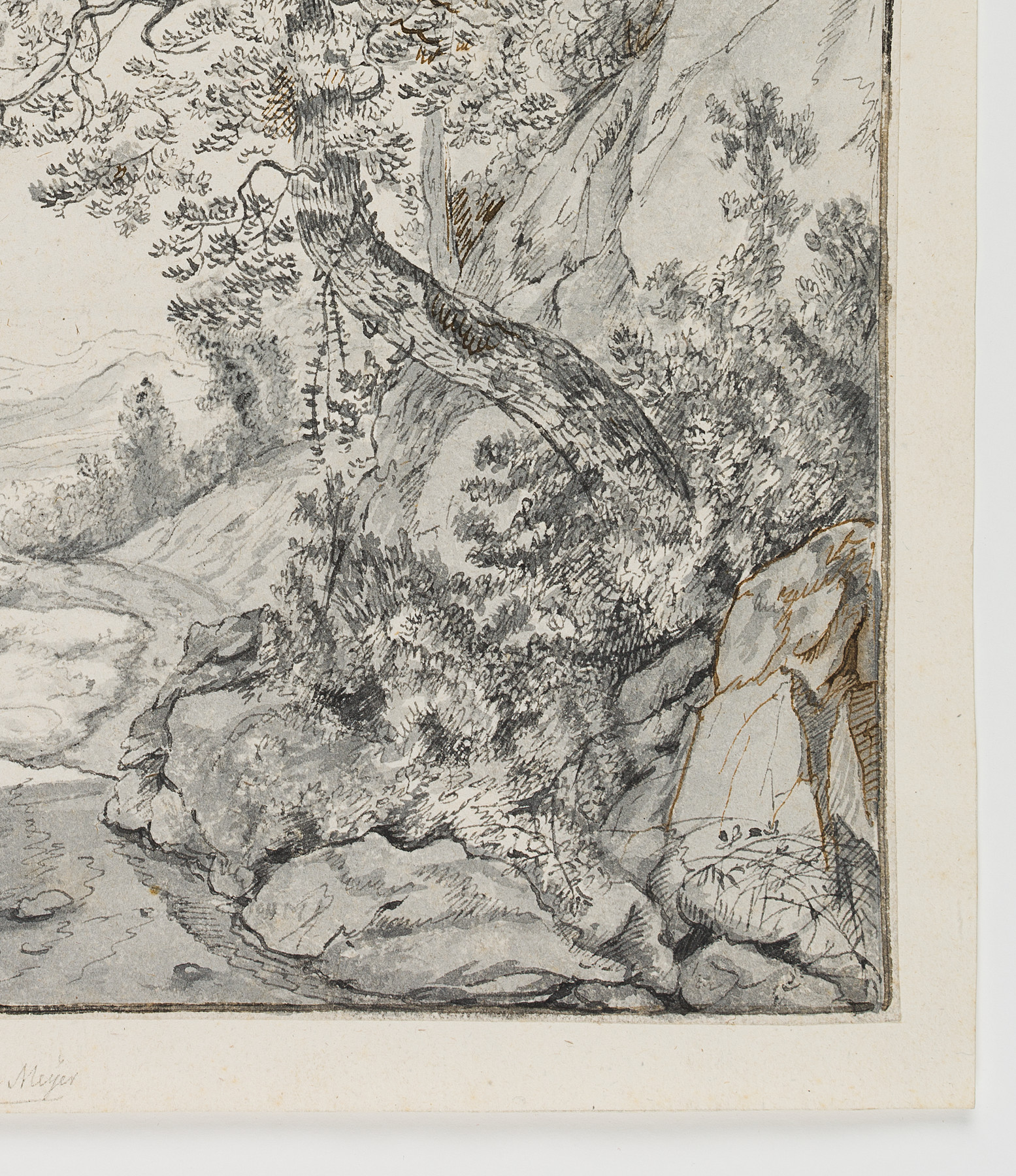 Johann Heinrich Meyer (*1694 Schaffhausen), Pfad im Gebirge mit auskragendem Baum, um 1750, Federzeichnung