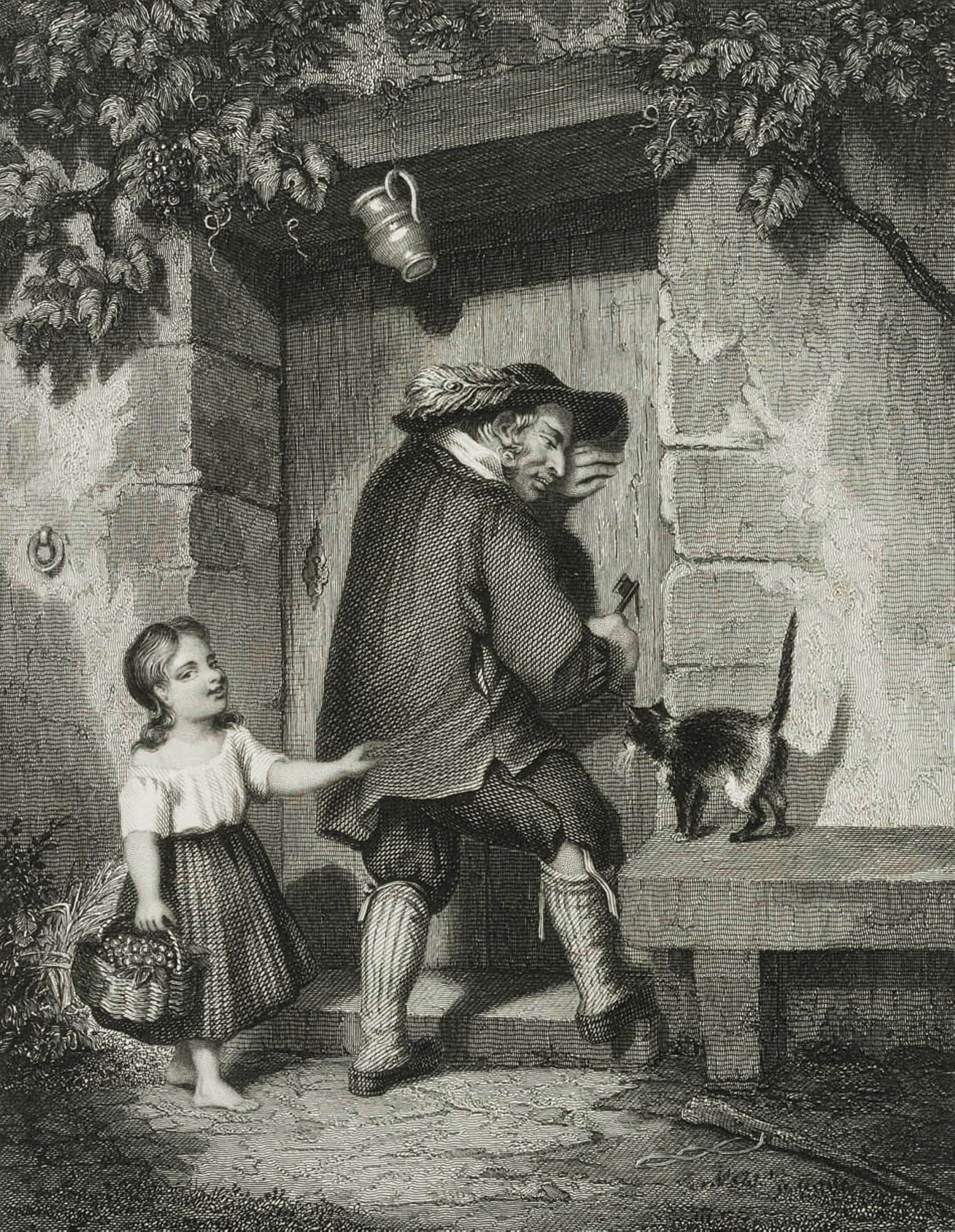 J. MOORE (19.Jhd), Betrunkener beim Öffnen einer Tür, Stahlstich Romantik