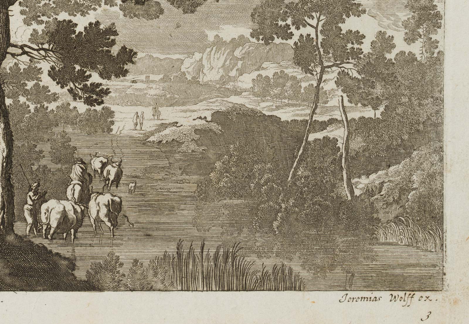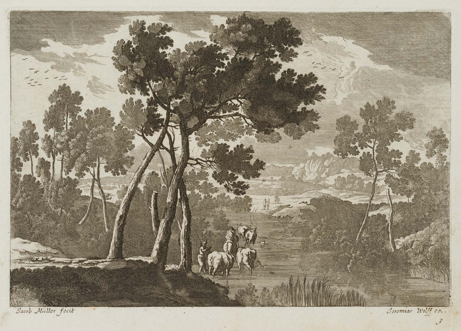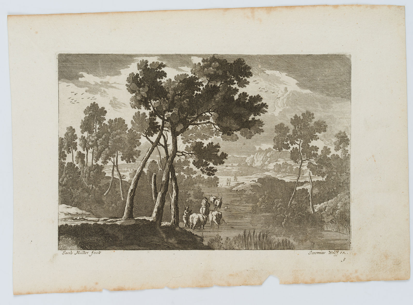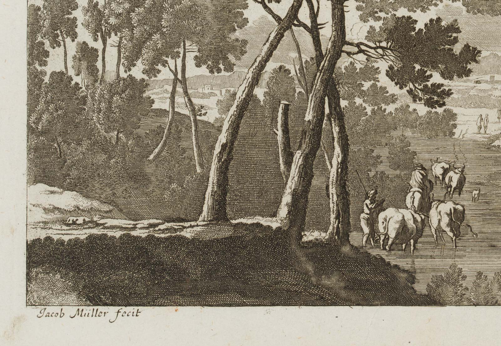 - Bezeichnung: Unten links in der Druckplatte signiert: “Jacob Müller fecit”. Herausgegeben von Jeremias Wolff (um 1663-1724) in Augsburg. Aus einer Serie von Landschaftsdarstellungen.