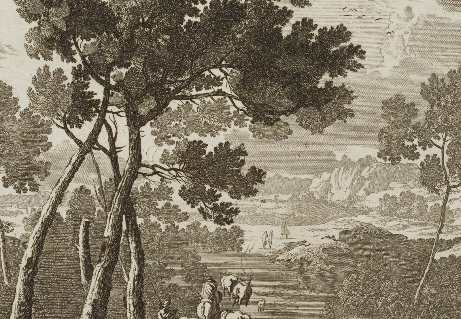Jacob Müller (17th century), Italian landscape with cattle herders in the river, c. 1680, Copper engraving