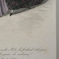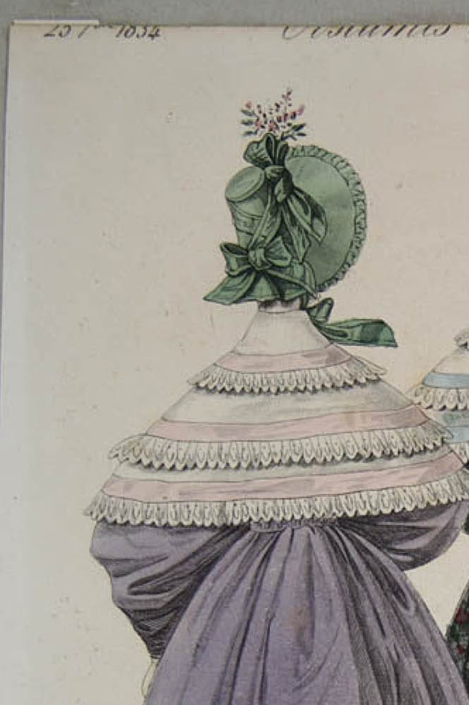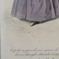 - Beschreibung: Kolorierter Stahlstich von J. D. Nargeot, bezeichnet oben: “257° 1834 Costumes Parisiene 3210”, bezeichnet unten: “Lanté del Nargeot sculp.”, darunter: “Capote en pou de soie garnie de ruche-Robe de foulard et de pou de soie damasse-Mantelet de tulle garni de rubana Journal de Dames Rue de Heldeo Chaussée d`Antin”. Zwei Damen präsentieren ihre weiten Kleider von vorn, bzw. von hinten. Über den Kleidern tragen sie einen Umhang, der hinten bis zur Taille reicht, vorne geschnürt ist und in einem schmalen Streifen über dem Rock weit nach unten fällt. Die breite Krempe des blumengeschmückten Hutes rahmt das zarte Antlitz der Dame. J. D. Nargeot (Paris 1795 – ca. 1864) war französischer Kupferstecher.