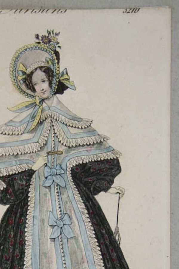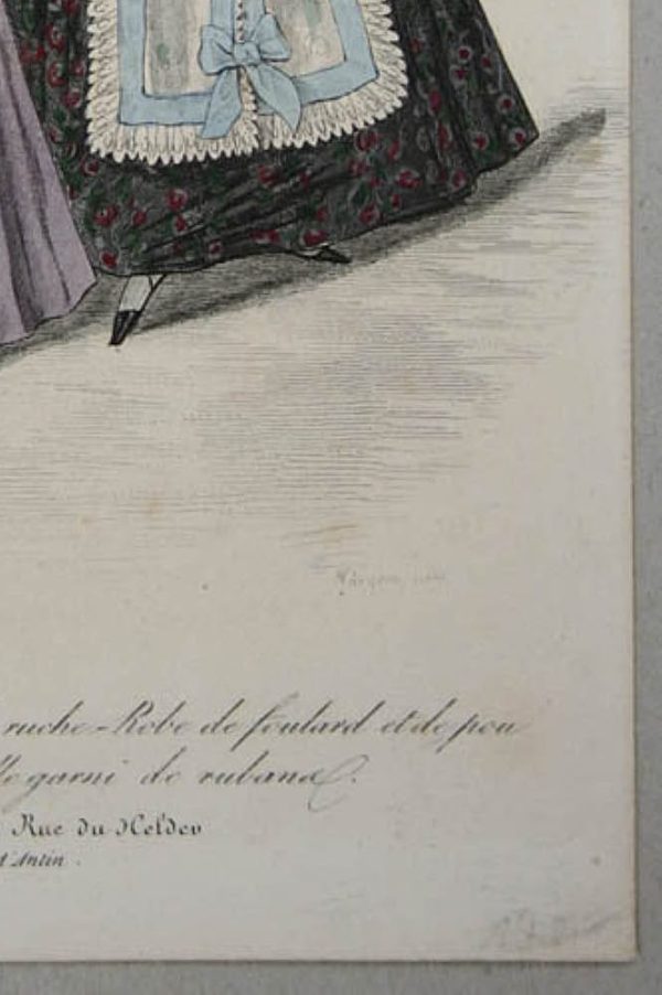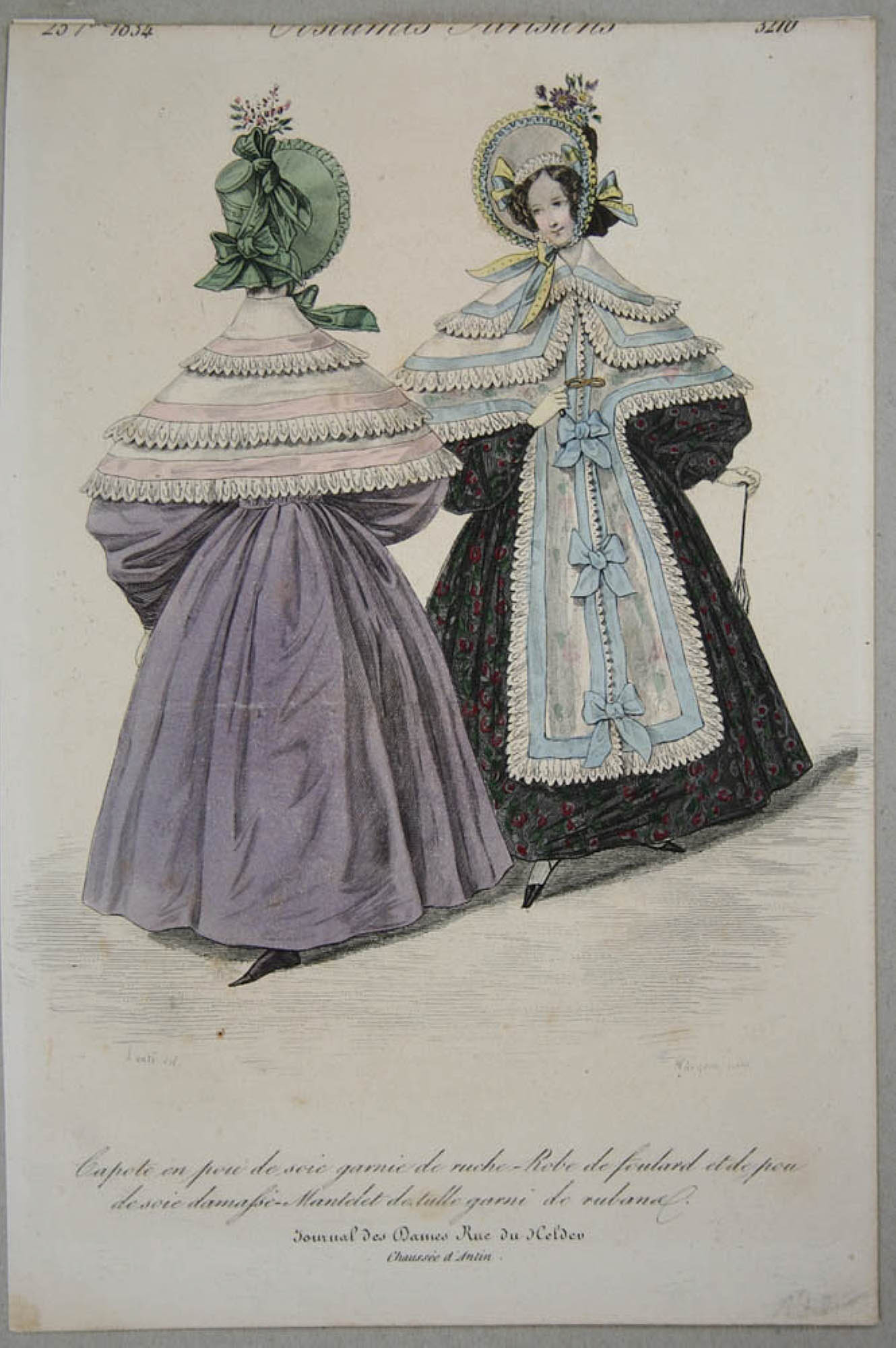 - Description: Colored steel engraving by J. D. Nargeot, inscribed above: “257° 1834 Costumes Parisiene 3210”, inscribed below: “Lanté del Nargeot sculp.”, below: “Capote en pou de soie garnie de ruche-Robe de foulard et de pou de soie damasse-Mantelet de tulle garni de rubana Journal de Dames Rue de Heldeo Chaussée d`Antin”. Two ladies present their wide dresses from the front, respectively from the back. Over the dresses they wear a cape that reaches to the waist at the back, is laced at the front and falls far down in a narrow strip over the skirt. The wide brim of the flower-decorated hat frames the lady’s delicate face. J. D. Nargeot (Paris 1795 – ca. 1864) was a French engraver.