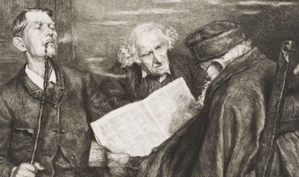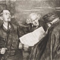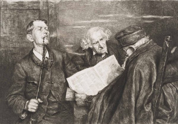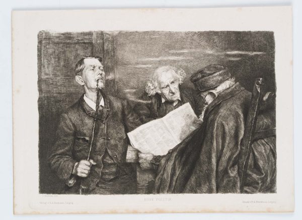 - Beschreibung: Drei ältere Herren in einem dunklen Interieur rauchend und sinnierend um einen Tisch sitzend. Der mit dem Rücken zum Betrachter Sitzende hält eine aufgeschlagene Zeitung in der Hand, die eine Nachricht enthält, die das Gesprächsthema der Männerrunde zu bestimmen scheint.