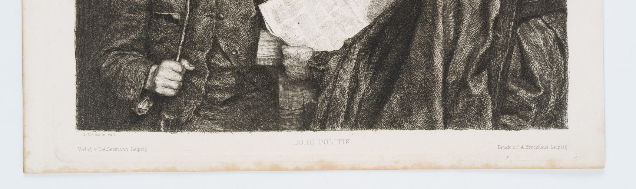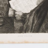 Julius Josef Neumann (1860 Essen – 1931 München), ‘Hohe Politik’. Sinnierende Altherrenrunde mit Zeitung, um 1900, Radierung