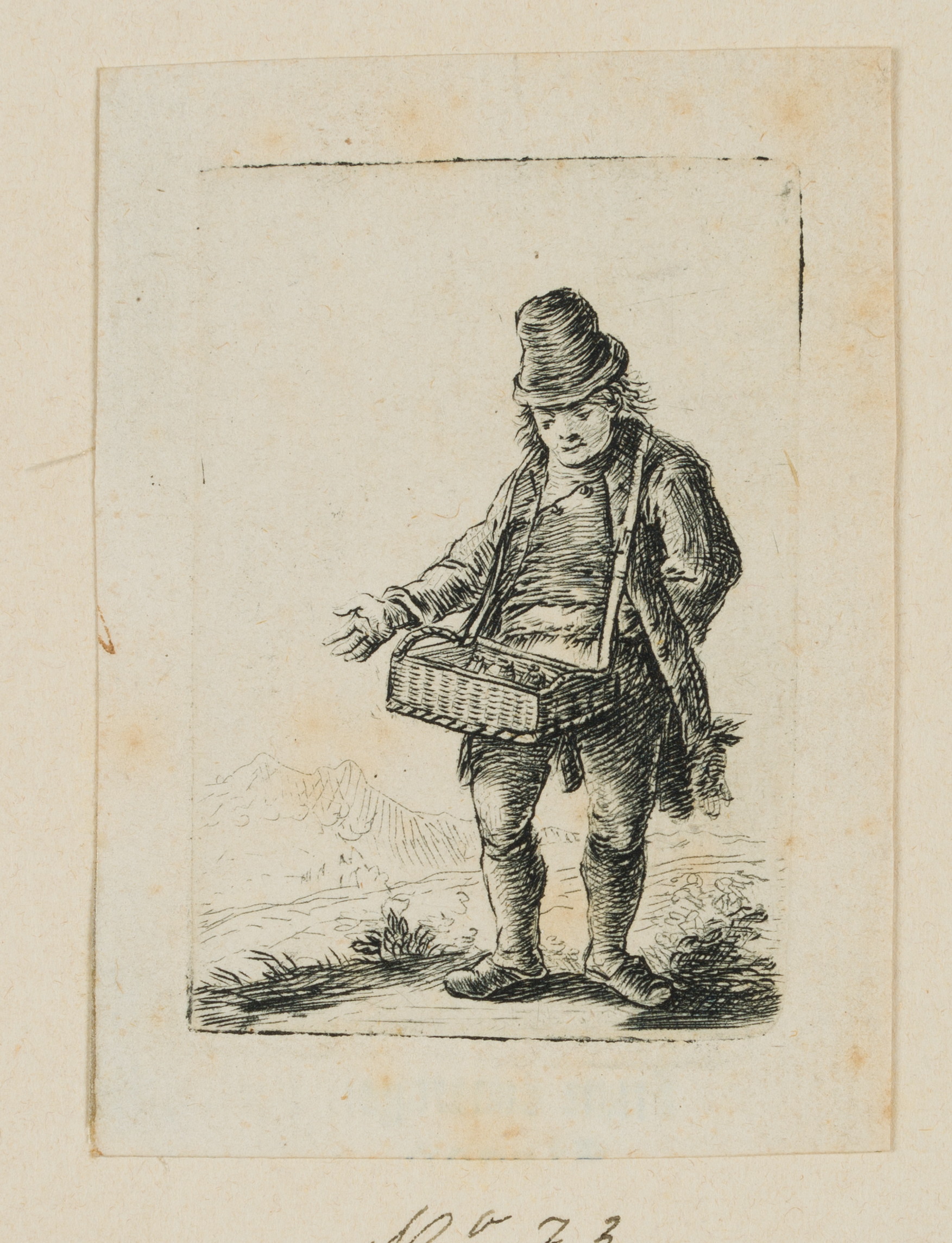 • Description: Rural trader or merchant in rustic costume. Standing in a landscape with a vendor’s tray.