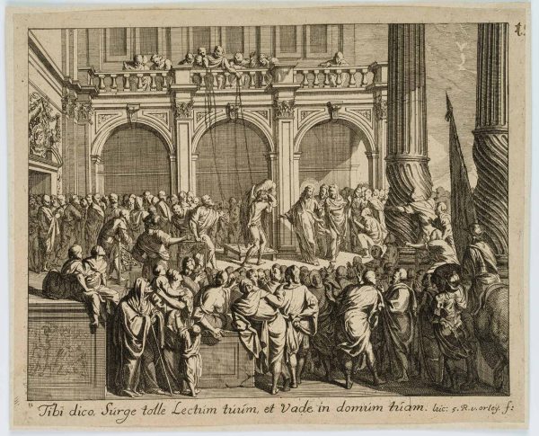 - Inscription: Inscribed below with the Latin verse Lucas 5, 25: “Tibi dico, Surge tolle Lectum tuum et Vade in domum tuam. luc: 5.” Signed “R. v. orley: f:” to the right. Numbered “11” at lower left.