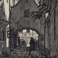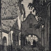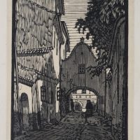 Jan Paroubek (1877 Bezdekov – 1962 Domazlice), View into the city centre of a city gate with pedestrians on the street, 1921, Woodcut