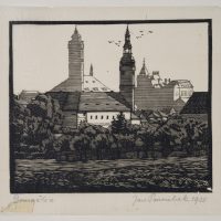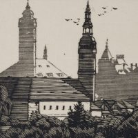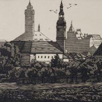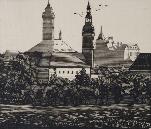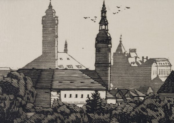 Jan Paroubek (1877 Bezdekov – 1962 Domazlice), View of the Hradčany castle complex in Prague from the banks of the Vltava river, 1920, Woodcut