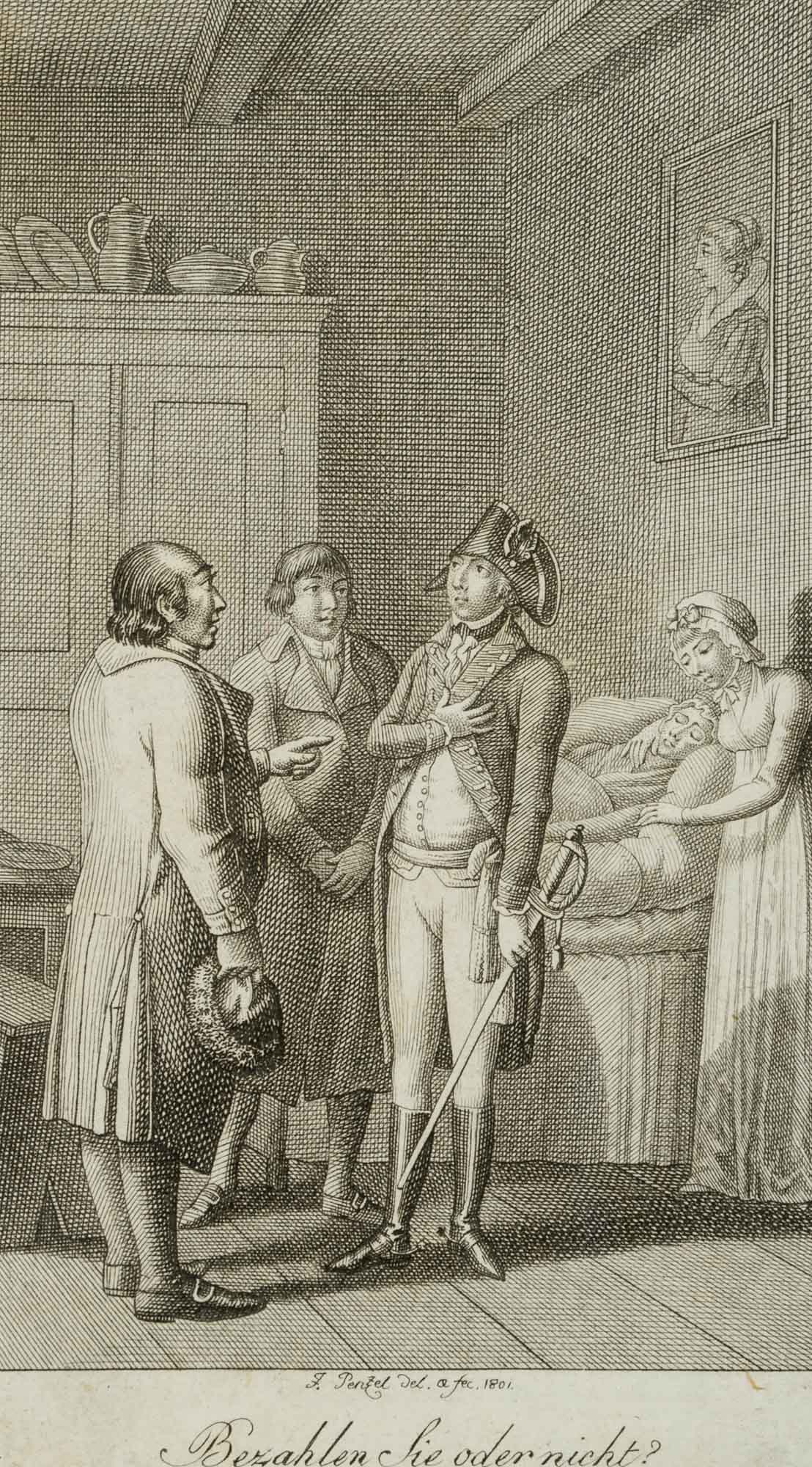 - Beschreibung: Mittig unter der Darstellung innerhalb der Druckplatte signiert und datiert: “J. Penzel del. et. fec. 1801”; darunter betitelt “Bezahlen Sie oder nicht?”.