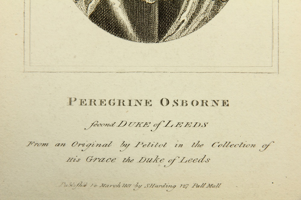 - Inscription: Below the oval-framed portrait there is an inscription in the printing plate with the sitter’s name and title. Below this is the reference to the original by Petitot, which is in the collection of the Duke of Leeds, as well as a reference to the publisher S.Harding in Pall Mall, London with a date of 1801.
