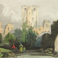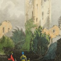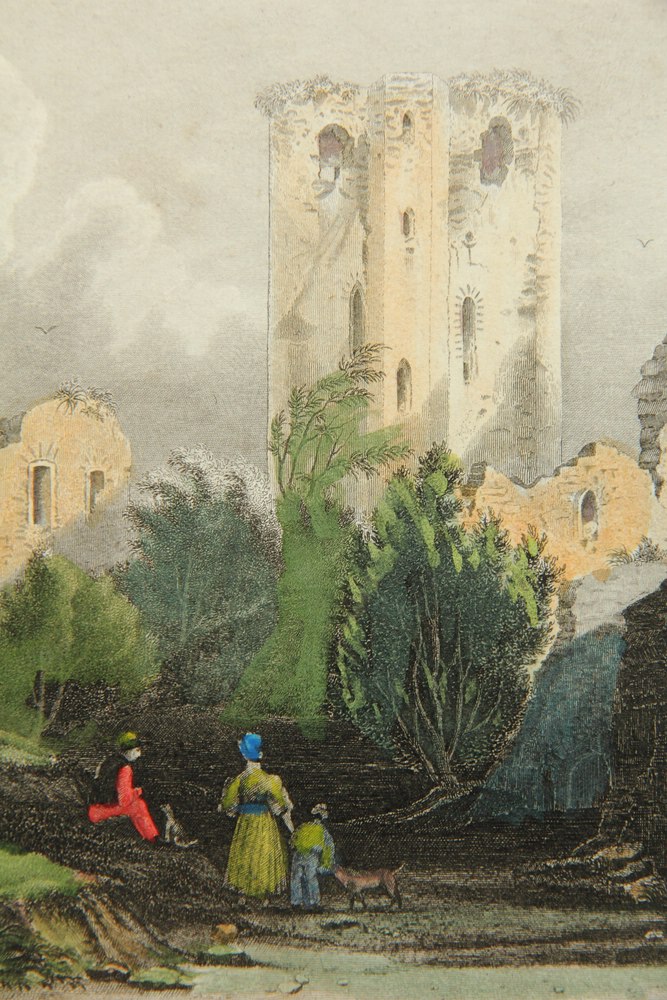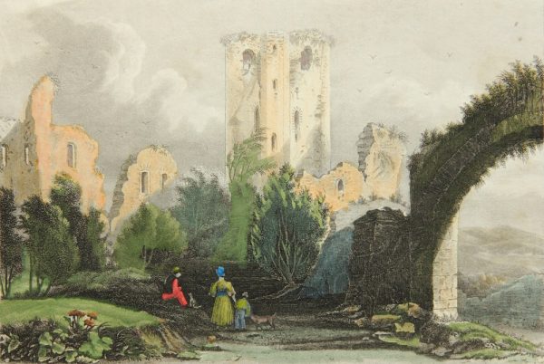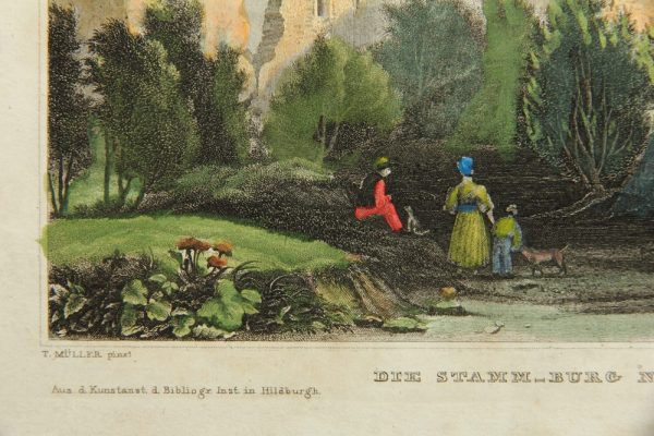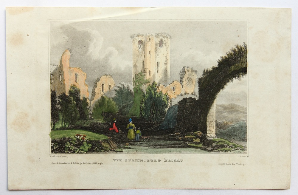 - Description: After an original by “T.Müller”. Romantic depiction of ruins in the courtyard of Nassau Castle above the Lahn Valley. In the foreground is a young family with child and two dogs looking at the ruins.