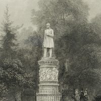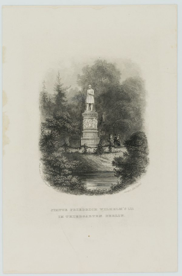 - Description: inscribed “sculpt. Joh. Poppel”, “After a photograph”, titled “Statue of Friedrich Wilhelm’s III in the Thiergarten Berlin”. View of the statue of Friedrich Wilhelm III, once designed by Friedrich DRAKE (1805 Bad Pyrmont-1882 Berlin). The king no longer wears a uniform, but simple civilian clothes. He is depicted less as a monarch than as a nature lover and quiet walker in a Sunday coat. The pedestal relief depicts the “Blessings of Peace” and the King’s benefactions to the Tiergarten.