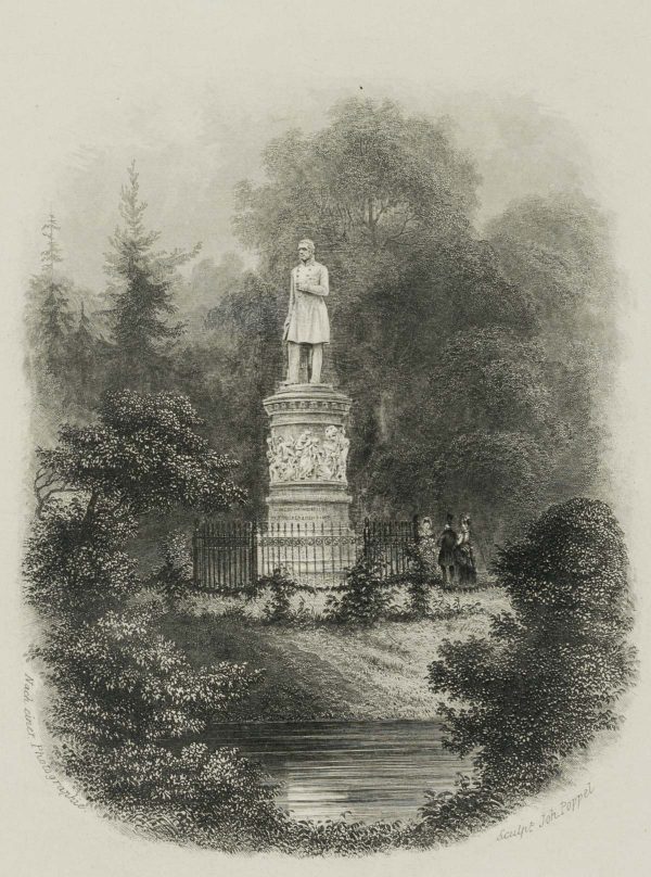 - Beschreibung: bezeichnet “sculpt. Joh. Poppel”, “Nach einer Photographie”, betitelt “Statue Friedrich Wilhelm’s III im Thiergarten Berlin”. Blick auf das Standbild Wilhelms III, einst von Friedrich DRAKE (1805 Bad Pyrmont-1882 Berlin) entworfen. Der König trägt keine Uniform mehr, sondern eine einfache zivile Kleidung. Er ist weniger als Monarch. denn als Naturfreund und stiller Spaziergänger im Sonntagsrock dargestellt. Das Sockelrelief schildert die “Segnungen des Friedens” und die Wohltaten des Königs für den Tiergarten.