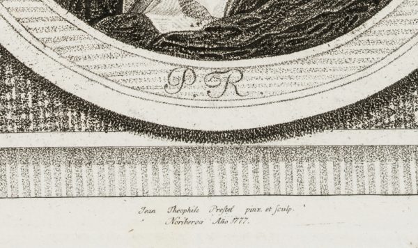 - Bezeichnung: Unten mittig in der Druckplatte mit den Initialen “P.R.” bezeichnet. Darunter signiert und datiert: “Jean Theophile Prestel pinx. et sculp. Noriberga Anno 1777”.