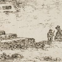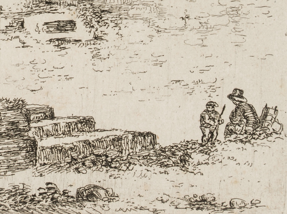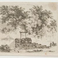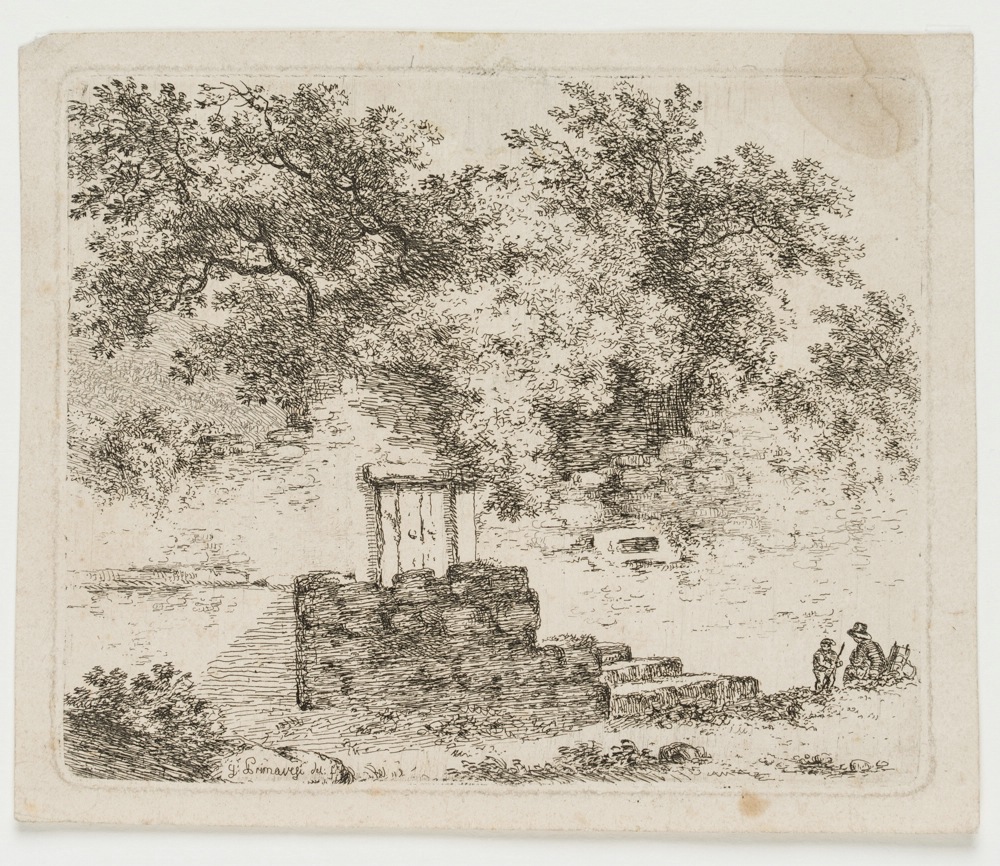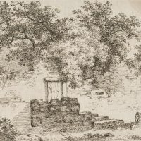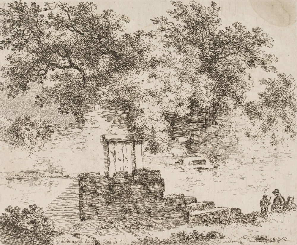 - Description: The German artist Primavesi was a pen pal of Goethe, with whom he had been in active correspondence not least since his employment as a theatre painter at the Court Theatre in Darmstadt. He is known for a large number of landscapes and prints, many of them with scenery. In the present etching he shows a ruin overgrown by trees with a mighty entrance staircase. Tiny and easy to miss, a seated traveller in a top hat is shown on the right talking to a boy. Next to him are presumably leaning drawing materials that the landscape artist has just put aside.